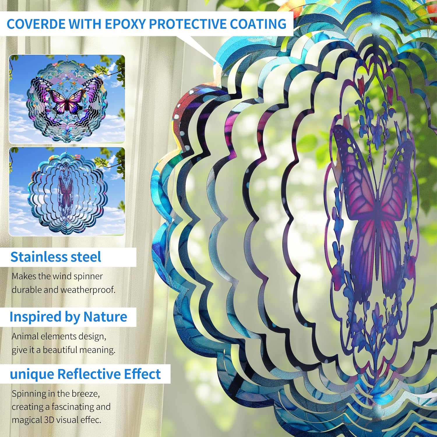 - 3D Butterfly Wind Spinner Outdoor, butterfly metal wind spinner is made from sturdy stainless steel material by laser-cutting technology to form vivid shape, makes it flexible and strong, is individually hand painted by epoxy protective coating with colorful sparkle powder inside to highly resist weather and rust. a frosted paint finish, giving off a sparkling when it spin. The unique design combined meaningful animal pattern and a 3D streamer effect.