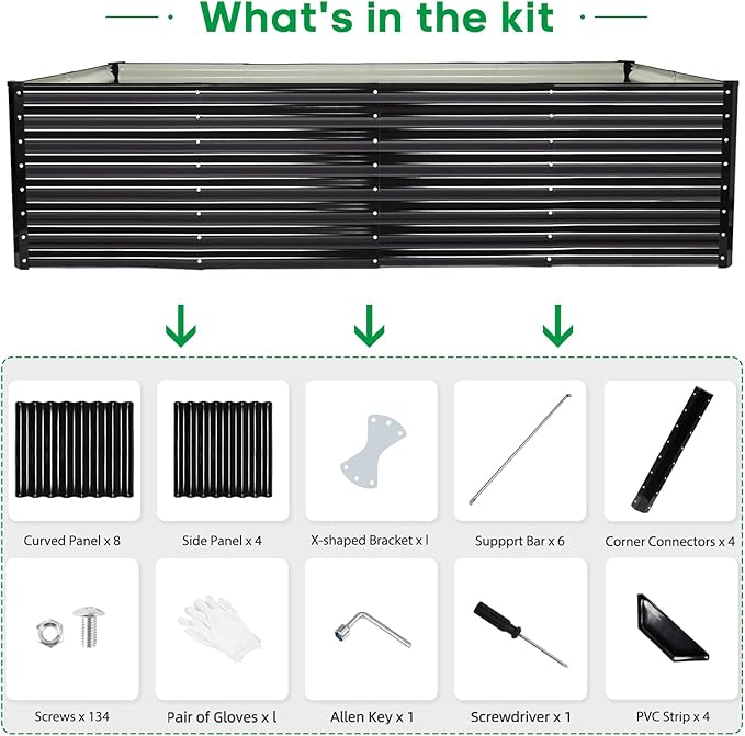 - What You Get: we have included Galvanized raised garden bed kit with detailed assembly instructions, corner protector, support rods ,safety gloves , wrench tools and with galvanized nuts and bolts in the box .These essential tools elevate your overall planting and gardening adventure