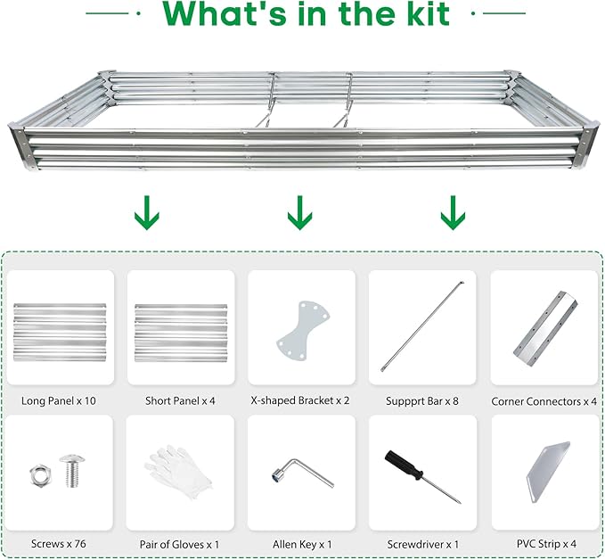 - What You Get: we have included Galvanized raised garden bed kit with detailed assembly instructions, corner protector, support rods ,safety gloves , wrench tools and with galvanized nuts and bolts in the box .These essential tools elevate your overall planting and gardening adventure