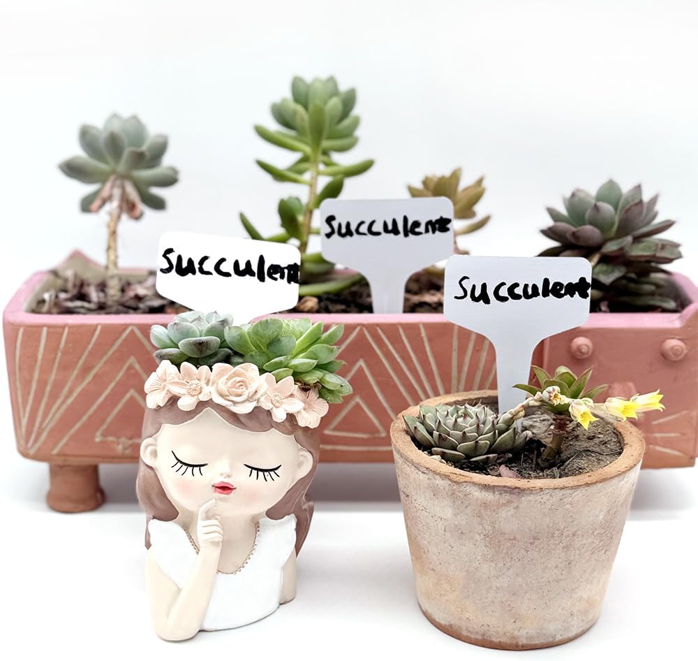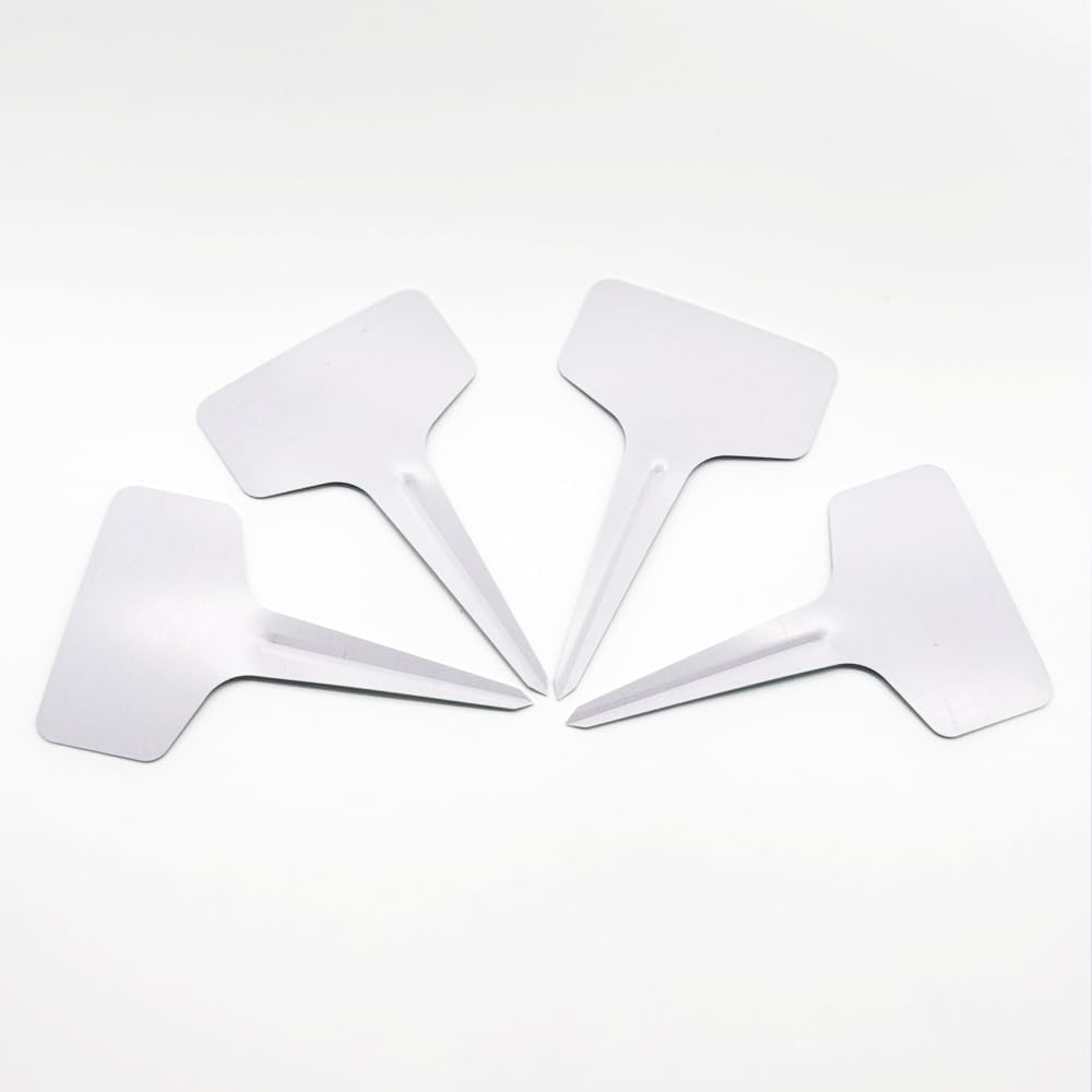 - 100 Pack of T-Type Plant Tags in White with a 2 pack of our high quality Garden Marker Pens (UV and fade resiistant permanent black markers with a strong industrail tip ) Garden Markers - labeling your gardening plant labels markers, wood crates, flower pots, signs, plant pot, garden tools, tool kit, and outdoor greenhouse planters, seed starter tray, nursery pots, plastic tray, gardening gloves, and much more has never been easier! A great addition to your gardening supplies! The plant labels size: 6x10cm (2.4x3.9 inch)
