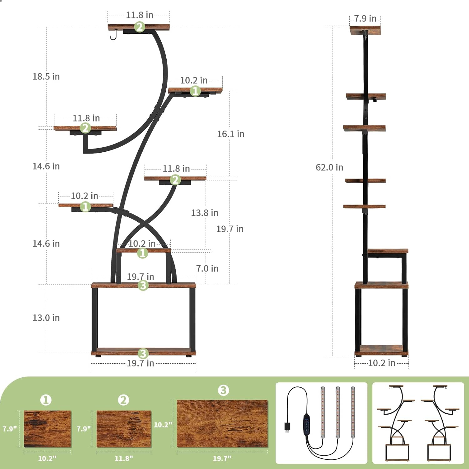 Uneedem Plant Stand Indoor with Grow Light, 8 Tiered Plant Shelf for Multiple Plants, 62" Tall Tree Shaped Metal Plant Rack Flower Holder for Room Corner Balcony Garden Patio