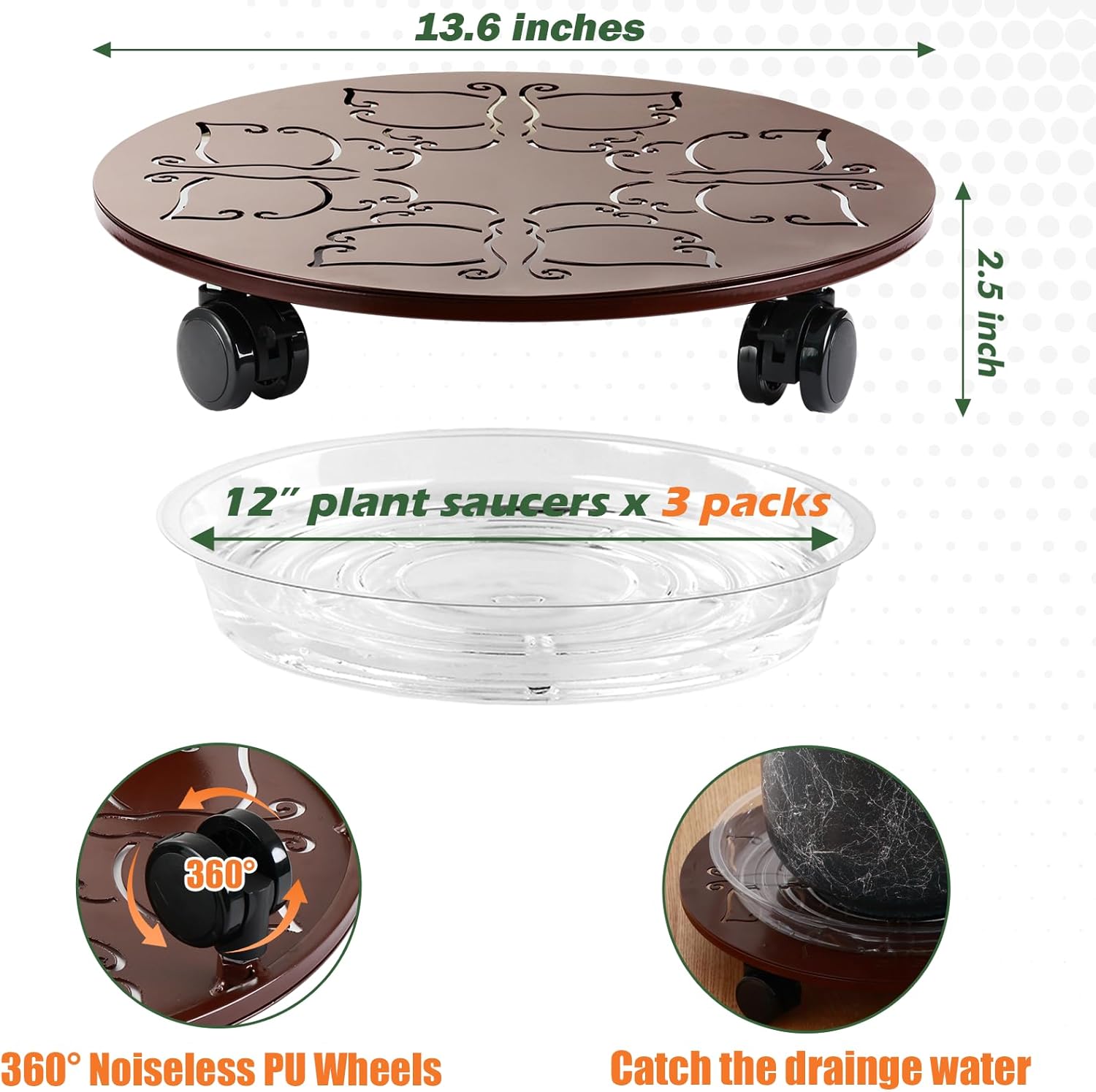 - Great value of 3: This set includes three packs of 14 inches rolling plant caddies with wheels and comes with 3 pcs of 12" clear plant saucer trays. The round tray will fit most home planters. And clear saucers keep your floor clean, prevent pots from leaking and can be used over and over again.