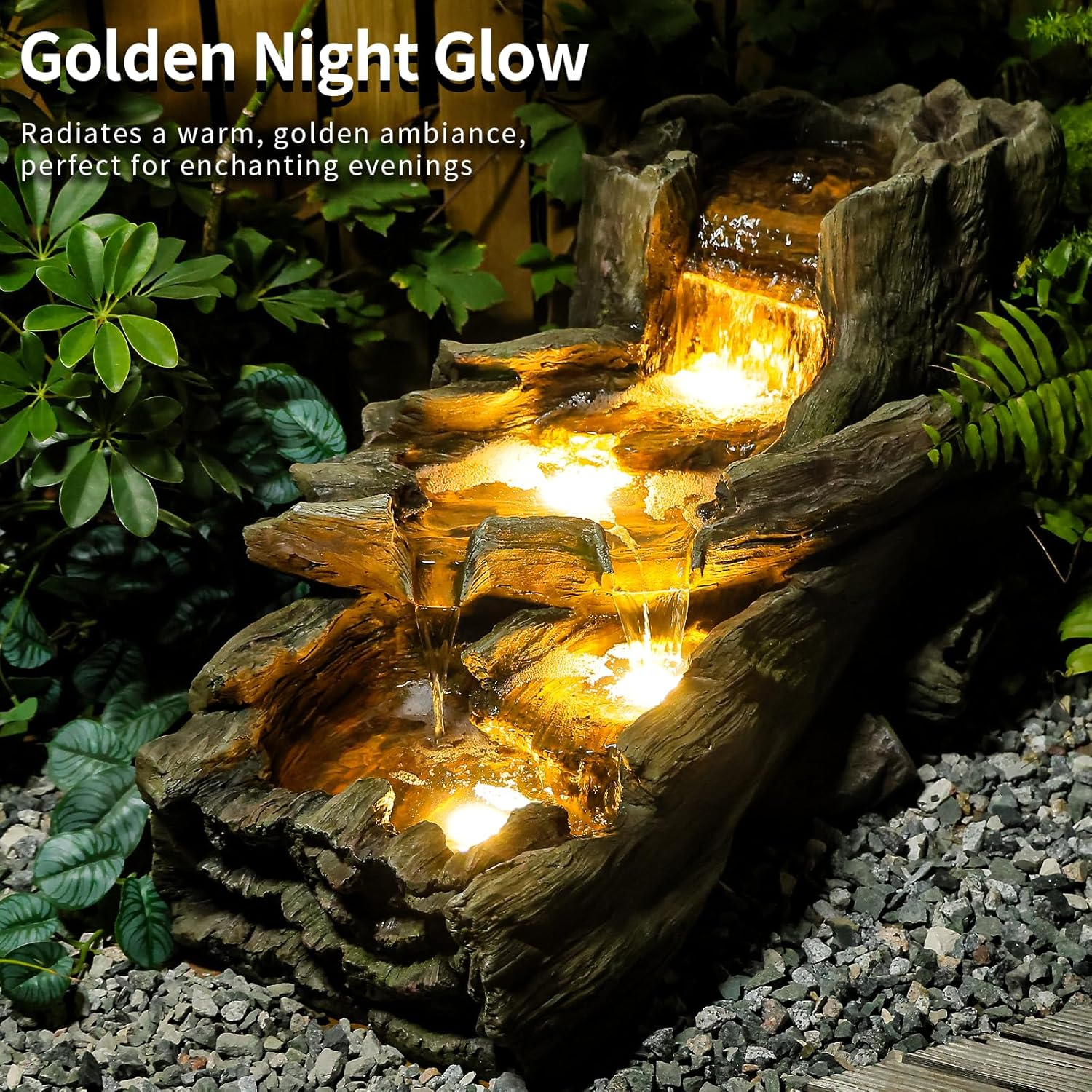 - GARDEN WATERFALL FOUNTAIN: This running water fountain has built-in golden lighting to create a warm atmosphere. The waterfall fountain will turn into a magnificent indoor decoration at night.
