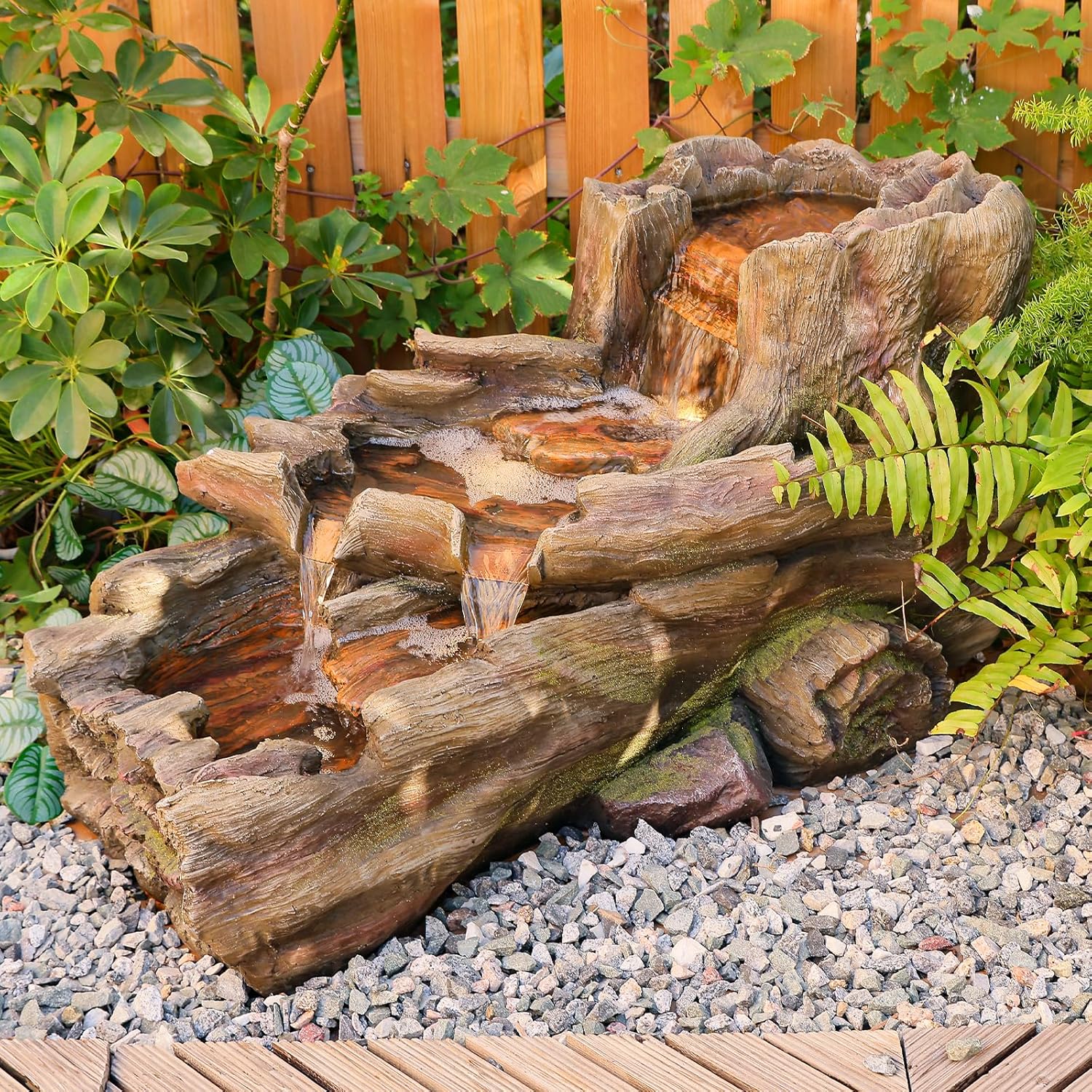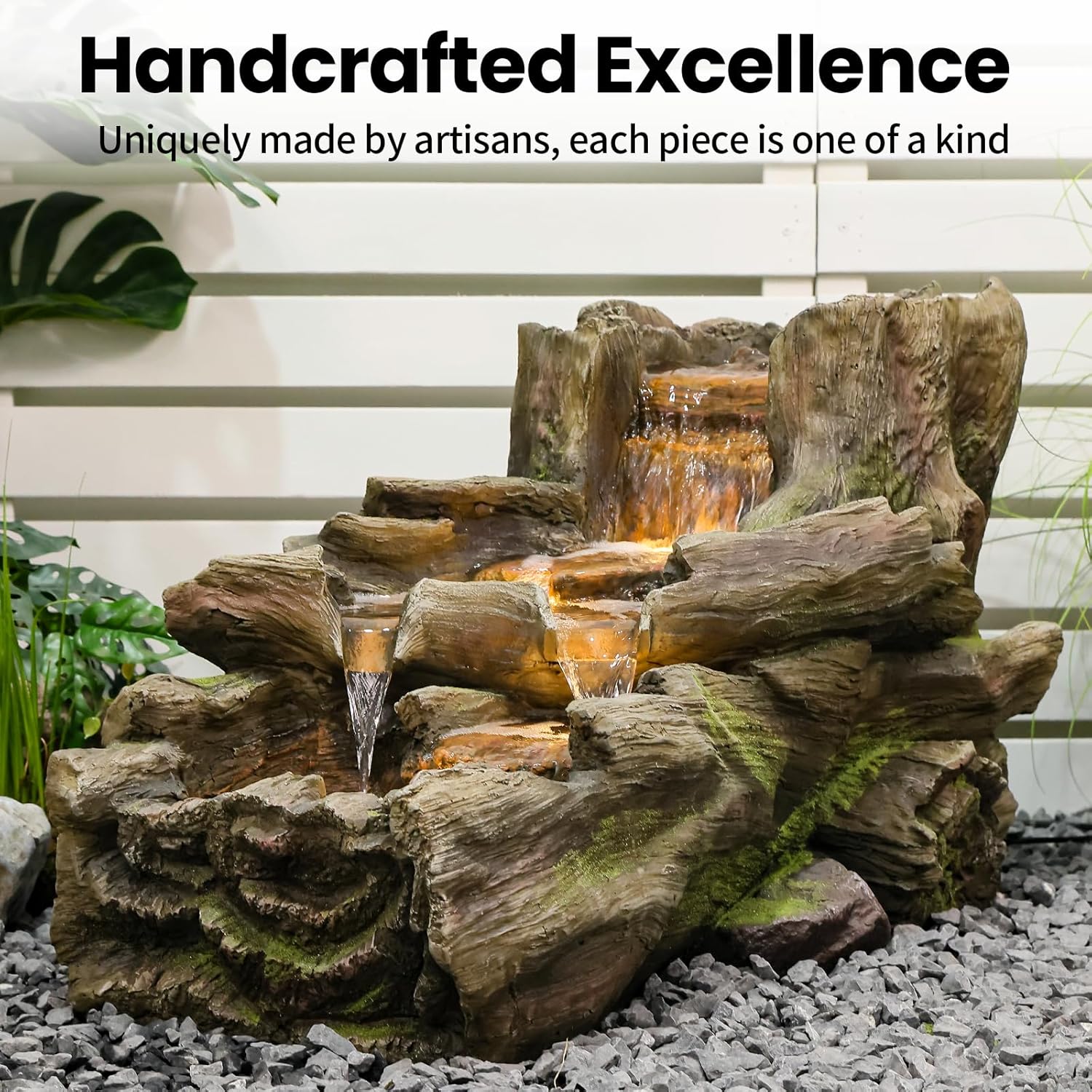 34.5" L Garden Outdoor Water Fountain, Floor Standing Wood Imitation Resin Natural Waterfall Fountains with LED Lights for Patio, Porch, Home Art Decor