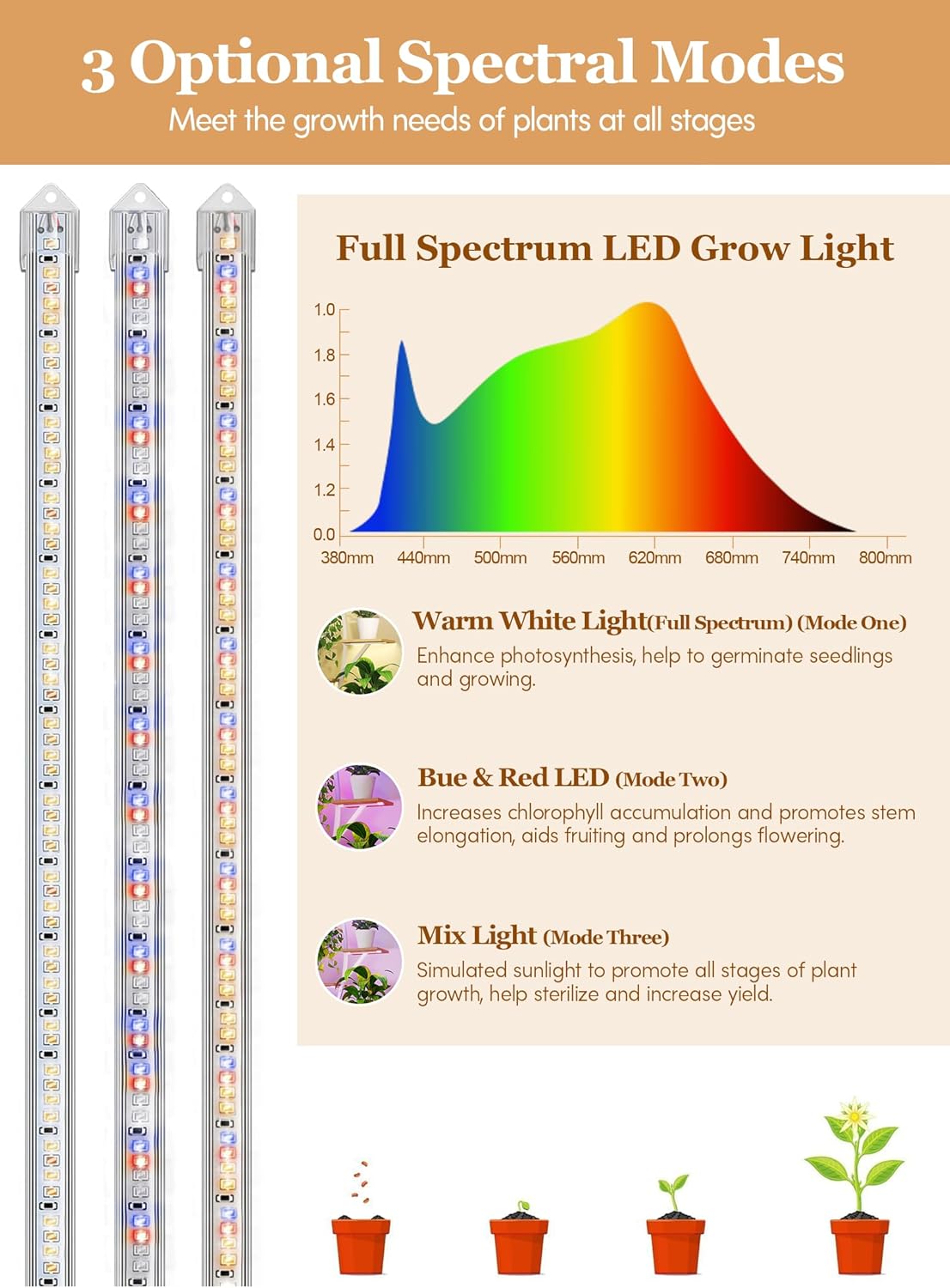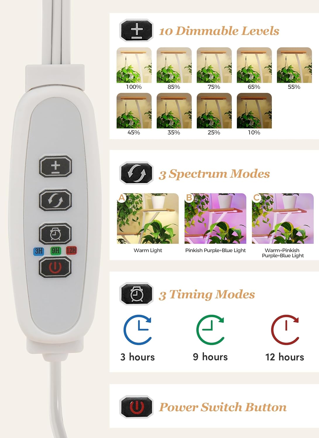 - 【Full Spectrum Growing Light】This indoor plant stand comes with 5-head growing lights with 3 spectrum settings grow lights for indoor growing: warm white (3000K) for natural sunlight simulation, red+blue (660nm+460nm) to boost growth stages, and full spectrum (380nm-780nm) for complete plant development. The timer (3H/9H/12H) and 10 brightness levels ensure optimal lighting for herbs, succulents and flowers without moving plants near windows