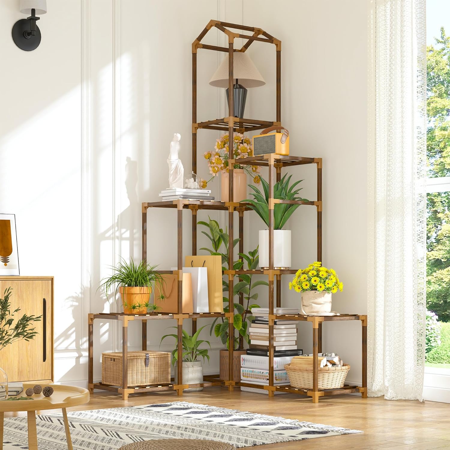 - 【Multifunctional Application】The plant stand with natural wood tones that go with anything. Tiered plant stand indoor design is suitable for all kinds of spaces, doubles as a storage shelf and home decoration, adding vibrancy to your surroundings. This versatile design isn't limited to plants alone – it seamlessly blends plant display, home decor, and storage, making it an all-in-one solution for your apartment, garden, yard, bedroom, sunroom, dorm, entryway, living room, patio, porch, office, balcony. Beyond showcasing your lovely bonsai, that serves as a versatile display for books, decor items, sculptures, pictures, trophies, etc