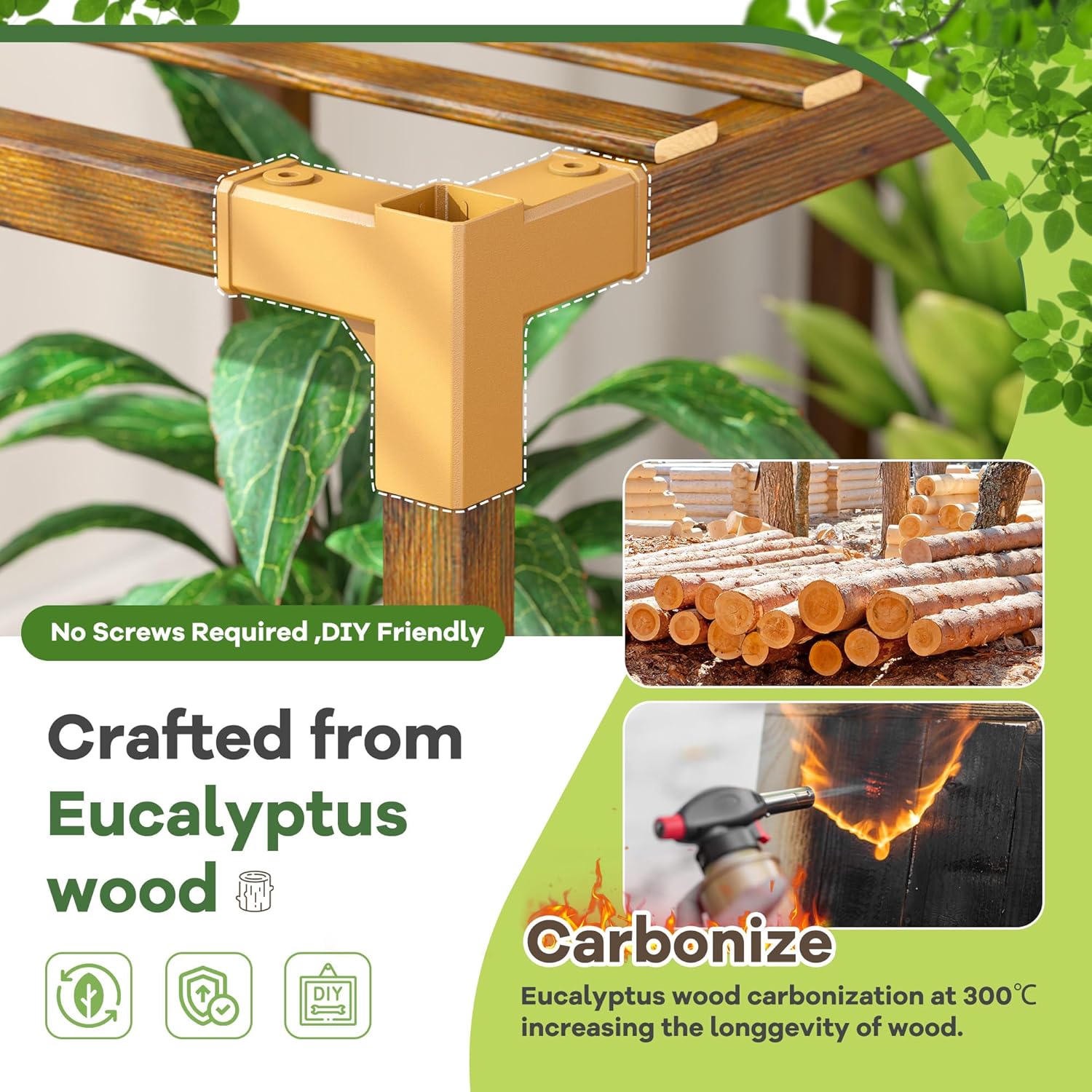 - 【Durable Carbonized Natural Wood and DIY Plant Shelves】The plant racks are made of premium wood and carbonized at high temperature, no fade, shrink, warp, crack. This process not only extends its lifespan but also ensures it remains a healthy choice, eliminating the need for extra paint or varnish, that enhances waterproof performance and extend service life for both indoor and outdoor use. You can customize the configuration, DIY to suit your preferences! Easily switch up the overall shape of the plant stand by simply changing the connections around. You can also split or connect multiple kits together to make displays that fit your space and create your indoor garden
