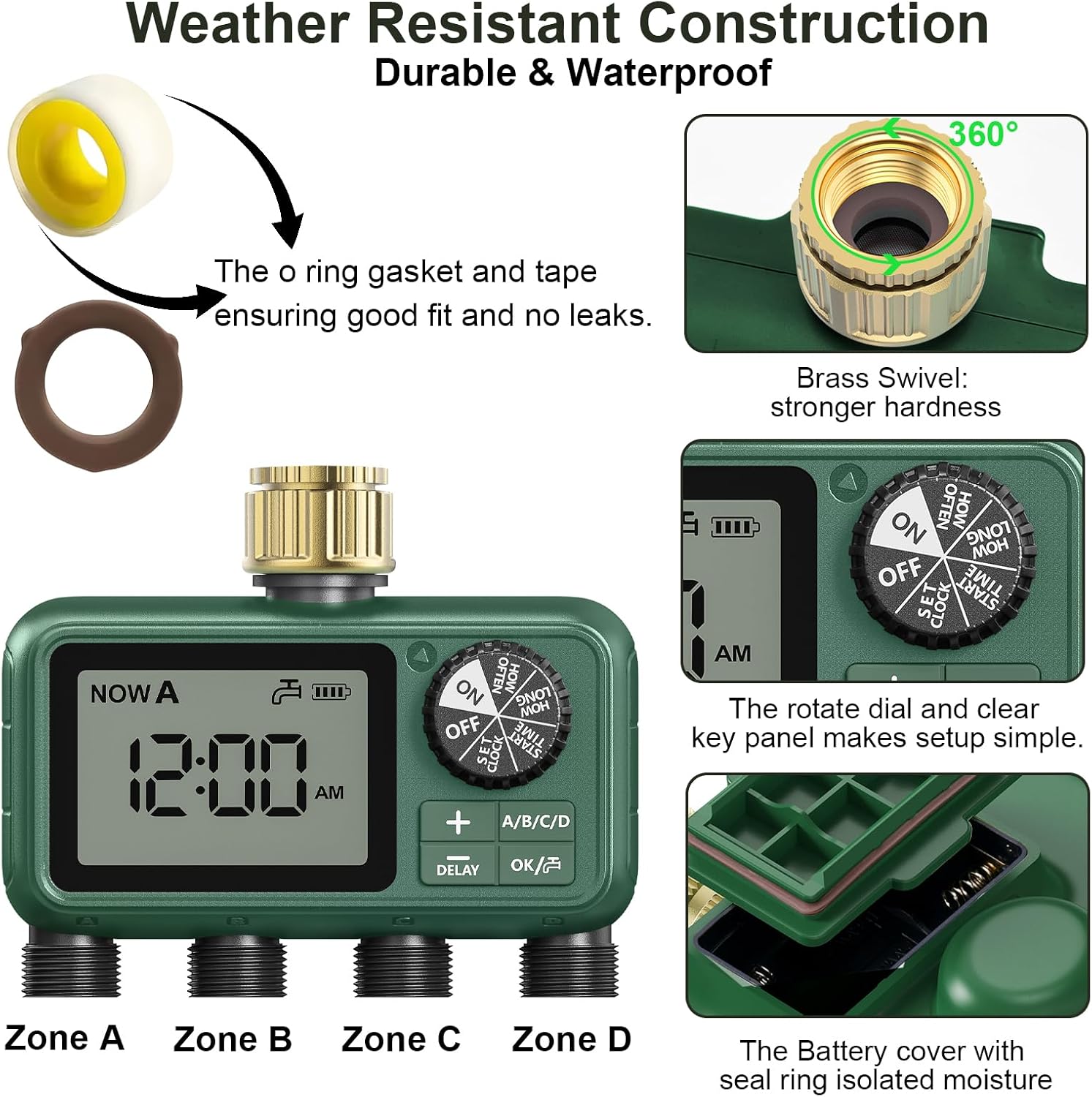 4 Zone Sprinkler Timer with Brass Inlet,Programmable Water Timer for Garden Hose with Rain Delay, Manual& Automatic Watering System,Programmable Digital for Lawn Yard,4 Zone