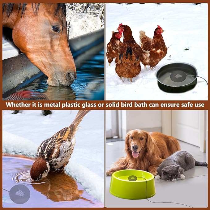 - Widely applicable; this product can be used in all bird baths, whether you have metal, plastic, glass or stone bird baths, it can ensure safe use. Bird bath water heaters also have models with water pumps for you to choose from. Whether it is for horses, chickens, birds...all kinds of small animals can be provided with fresh warm water.