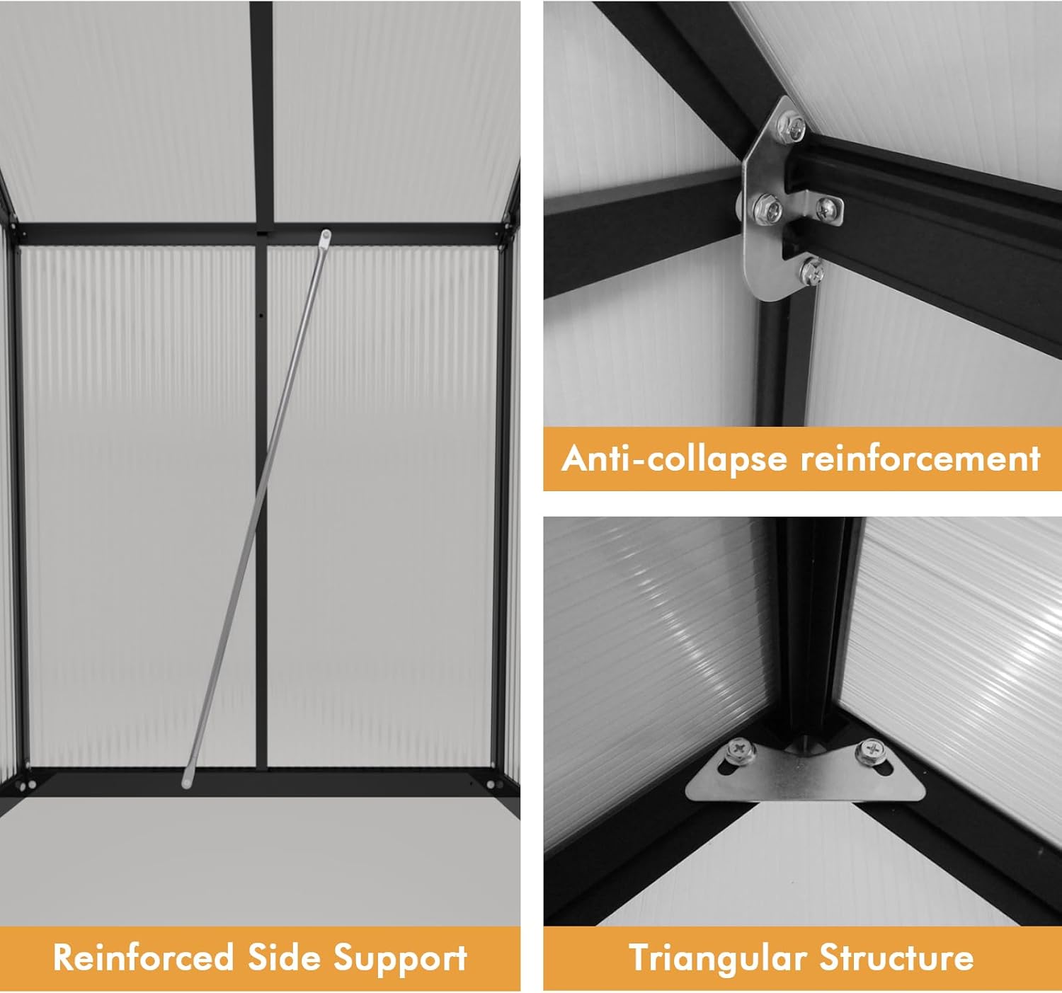- QUALITY UV RESISTANT PANELS – The 580g PC panels of this mini greenhouse that are 4mm thick and twin-wall polycarbonate roof panels are designed for strength and clarity. These shatterproof panels let in just the right amount of light while controlling humidity and temperature in your greenhouse. They effectively block harmful UV rays, creating the great environment for your plants to thrive and preventing sunburn