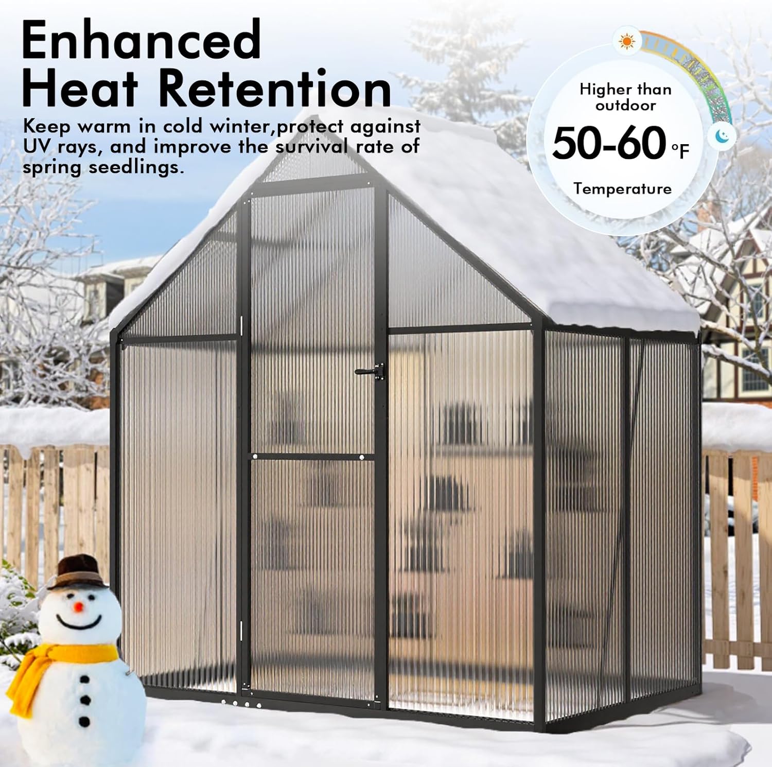 - STURDY & STRONG – This is a really nice solid green houses for outside, no matter what weather conditions. We use high-quality aluminum alloy to strengthen its frame. Combined with heavy-duty polycarbonate panels, this greenhouse can withstand harsh weather conditions such as strong winds, heavy rains, and blizzards. You can inject glass glue into the gaps of the PC board to make it more sturdy