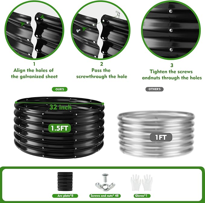 - Materials and Construction: The raised garden bed kit is constructed with sturdy metal 0.8mm thick, providing a reliable framework for your garden.The round-shaped design adds a unique aesthetic,and the 17" height provides ample depth for plants