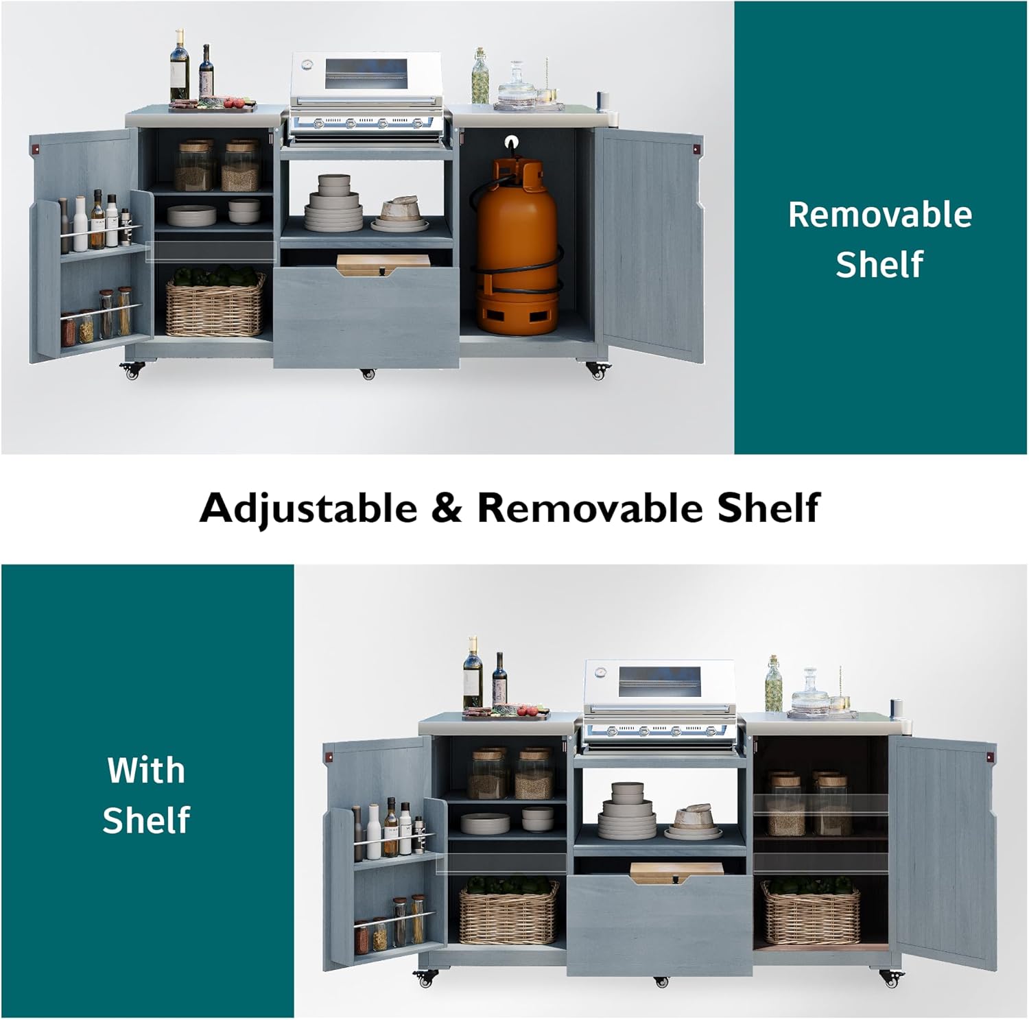 - [Optimal Workspace] The outdoor grill cart features a spacious central drawer, two cabinets and two 18.5” x 23” stainless steel tables at each end. By placing the middle adjustable shelf on top, you can connect them to create a large 60” x 23” table with a total work area of 1380 sq inches, ideal for any outdoor use. If you wish to utilize a gas grill on top and store a gas cylinder within the full cabinet, you can safely route the gas line through the exit hole for an optimal setup.