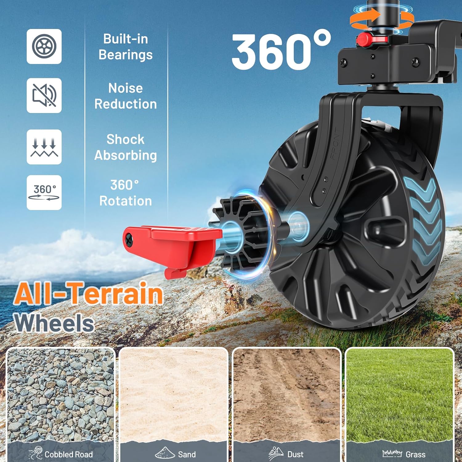 - All-Terrain Performance: 360° rotating PVC wheels with bearings ensure smooth movement on sand, grass, or slopes. Ergonomic telescoping ABS handle adjusts from 23.2-32.7 inches with secure brakes and storage cover.
