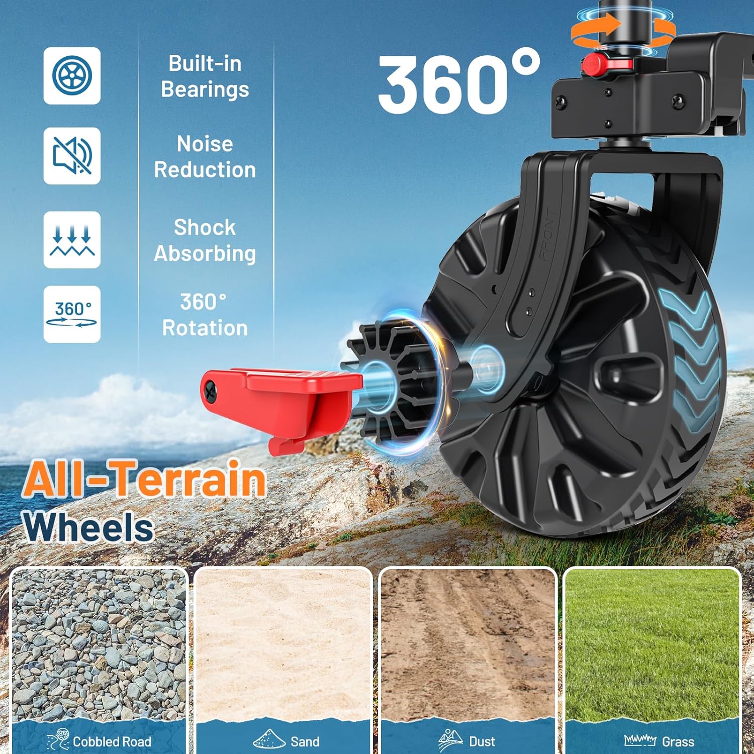 - All-Terrain Performance: 360° rotating PVC wheels with bearings ensure smooth movement on sand, grass, or slopes. Ergonomic telescoping ABS handle adjusts from 23.2-32.7 inches with secure brakes and storage cover.