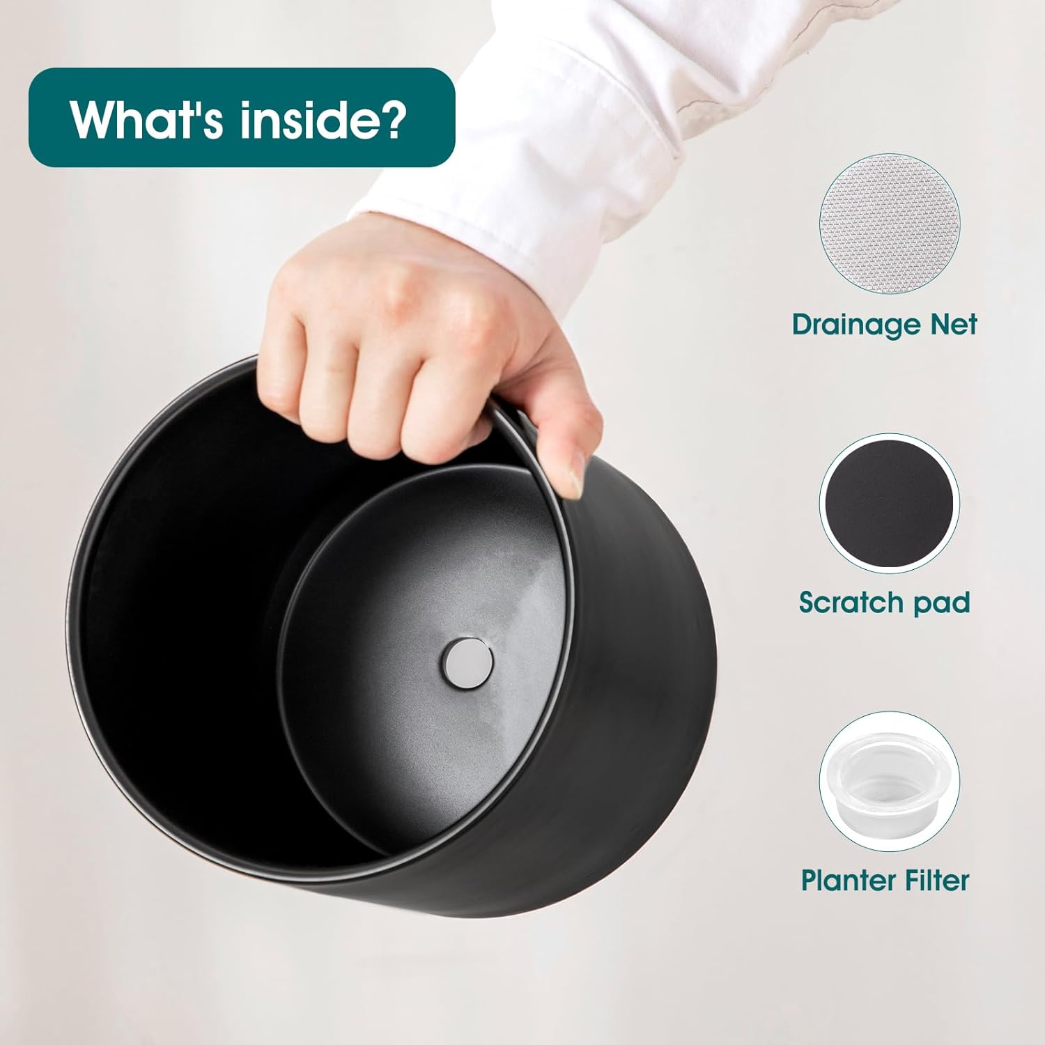 - 【Smart Drainage System】 Central bottom drainage hole + 3 essential accessories for hassle-free care: Mesh Filter prevents soil leakage and keeps surfaces clean. Anti-Scratch Pads protect tables and floors from scratches. Silicone Drain Plug lets you control water flow—no messy spills! Switch between drainage and water storage modes with ease.