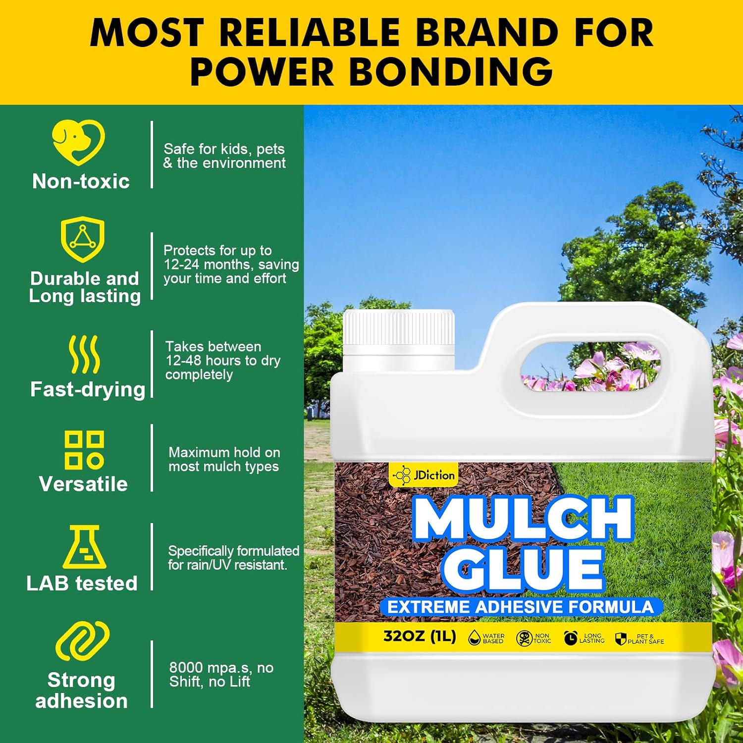 - ✅【EFFORTLESS APPLICATION】Looking for a mulch glue for all types mulch? JDiction Mulch Glue features a concentrated formula that makes up to 3X more than pre-mixed options. For general landscaping, dilute with 10%–50% water, shake well, and spray or pour evenly over dry mulch. After the first coat, rake the surface, then apply 2–3 thin layers for optimal hold—letting each layer dry fully. For high-traffic areas, use the glue undiluted and mix directly with clean, dry materials.