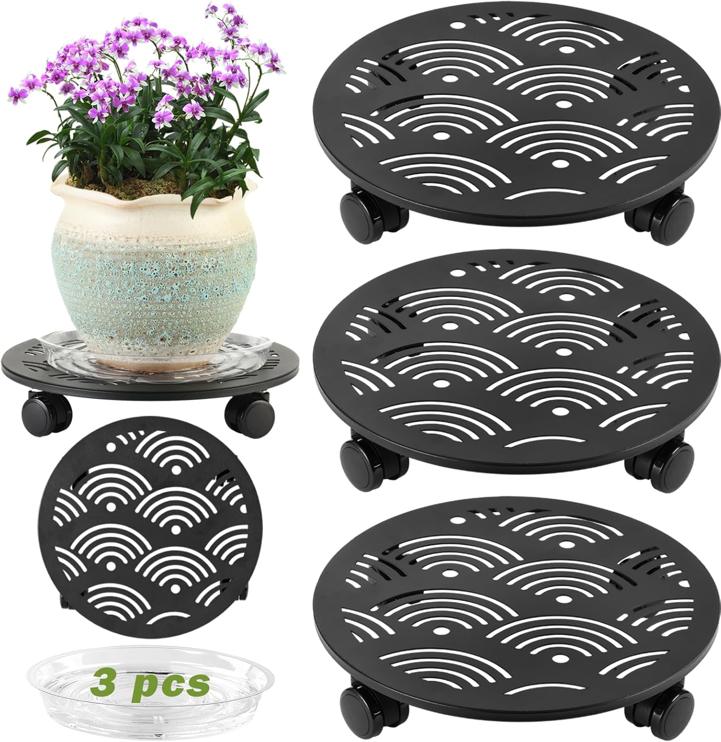 - Great value of 3: This set includes three packs of 13.5 inches of round metal rolling plant caddies and comes with extra 3 packs of of 12" clear plant saucer trays. The round tray will fit most home planters. And clear saucers keep your floor clean, prevent pots from leaking and can be used over and over again.