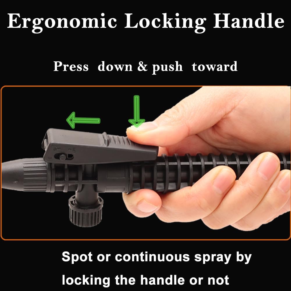 - 【Leak-proof & Lock Button Large sprayer】❀ Triple-sealed system (O-ring valve stem + silicone gasket + pressure relief valve) prevents drips. Hand pump garden Sprayer 2L design black button, press and push the button under the pump black cover , weed sprayer easy and relax.