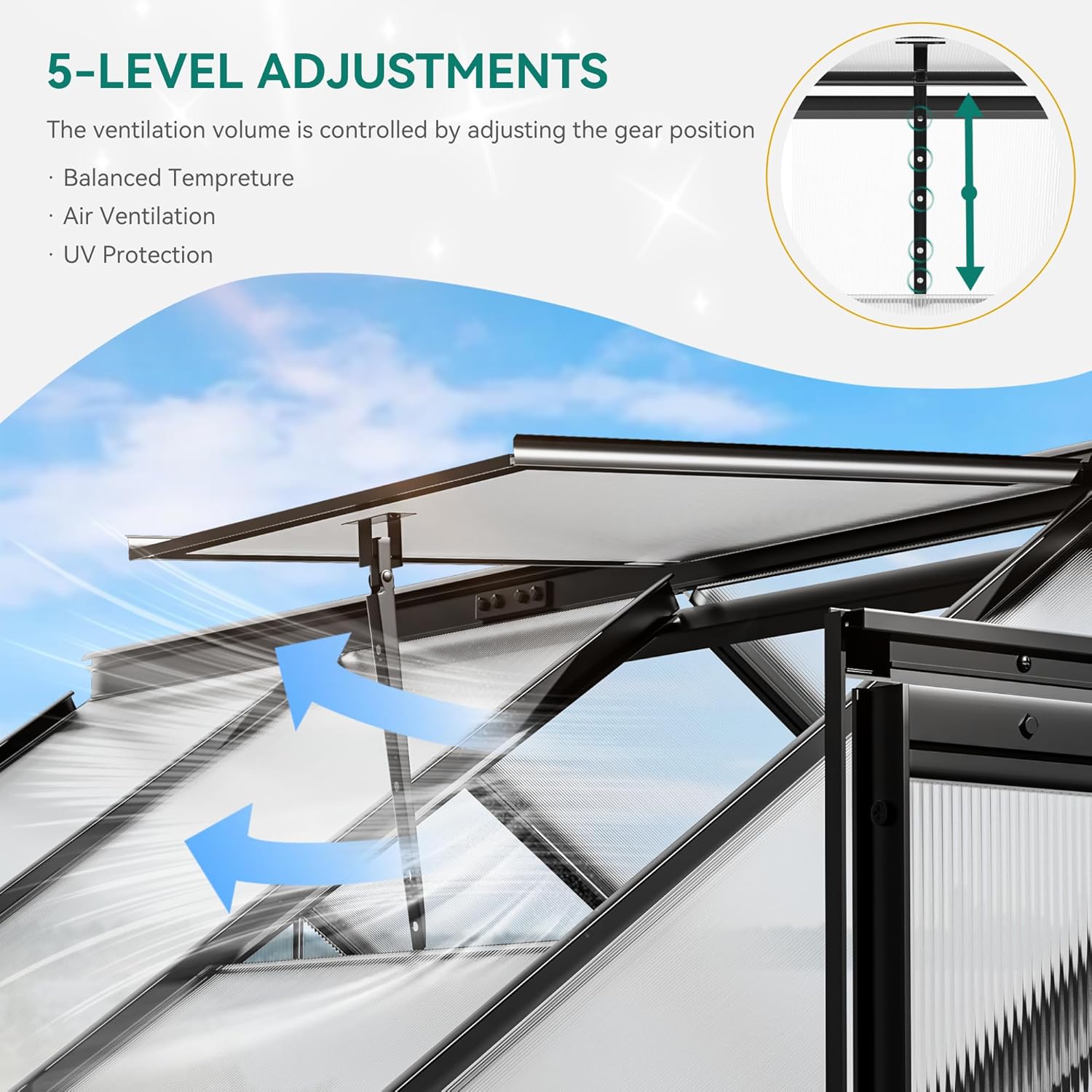 - UPGRADED MATERIALS- 6x8FT polycarbonate greenhouse is constructed using a premium aluminum alloy frame, along with reinforced rods on the sides and diagonal rod fixation for enhanced sturdiness and load-bearing capacity; Double-wall polycarbonate boards with 4mm UV protection effectively blocks 99% of UV radiation to protect your plants