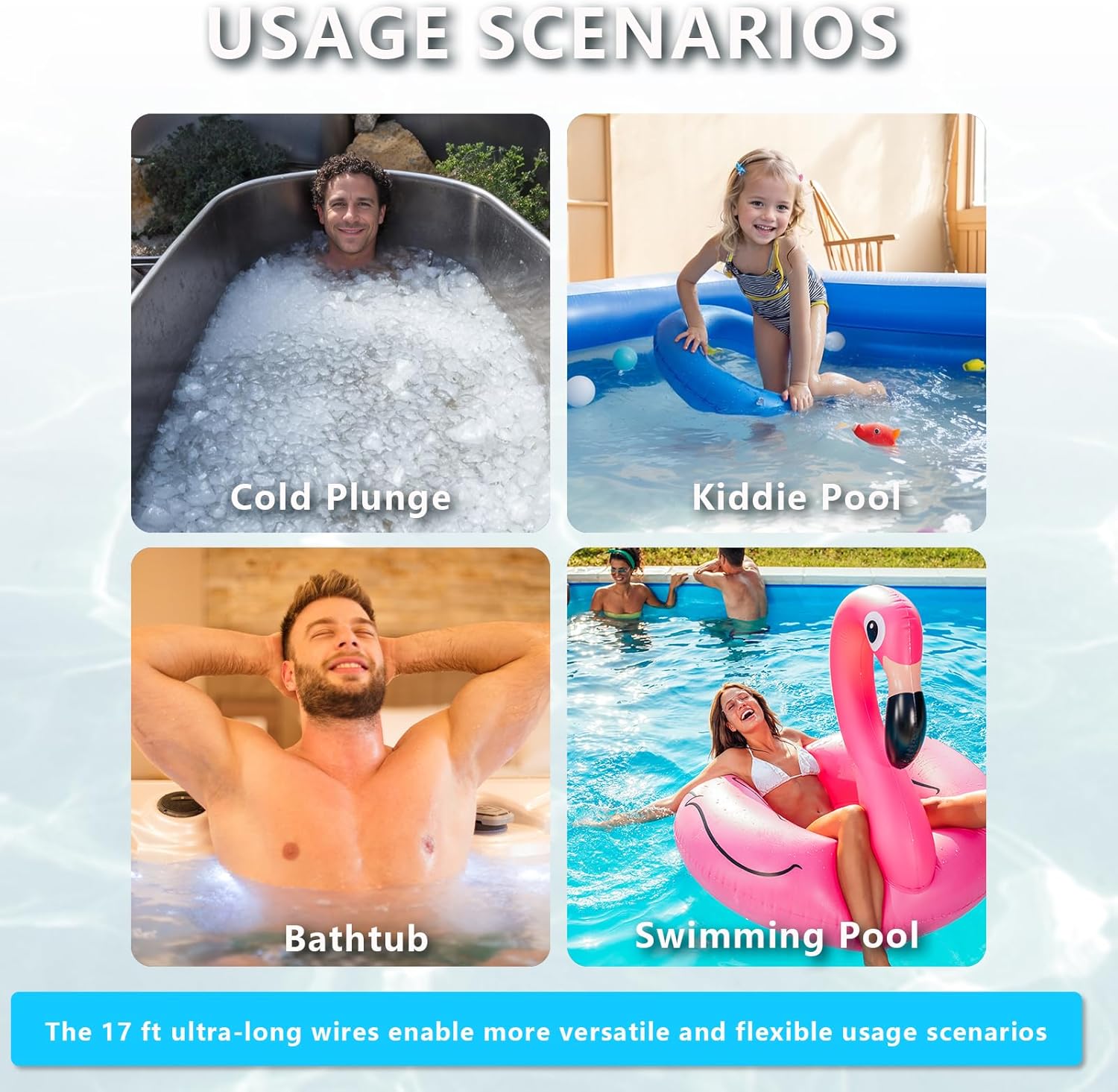 - 17 FT POWER CORD - Extends the UV light’s range, making it easy to connect to power sources, whether for pond or small cold bath tubs or large commercial units