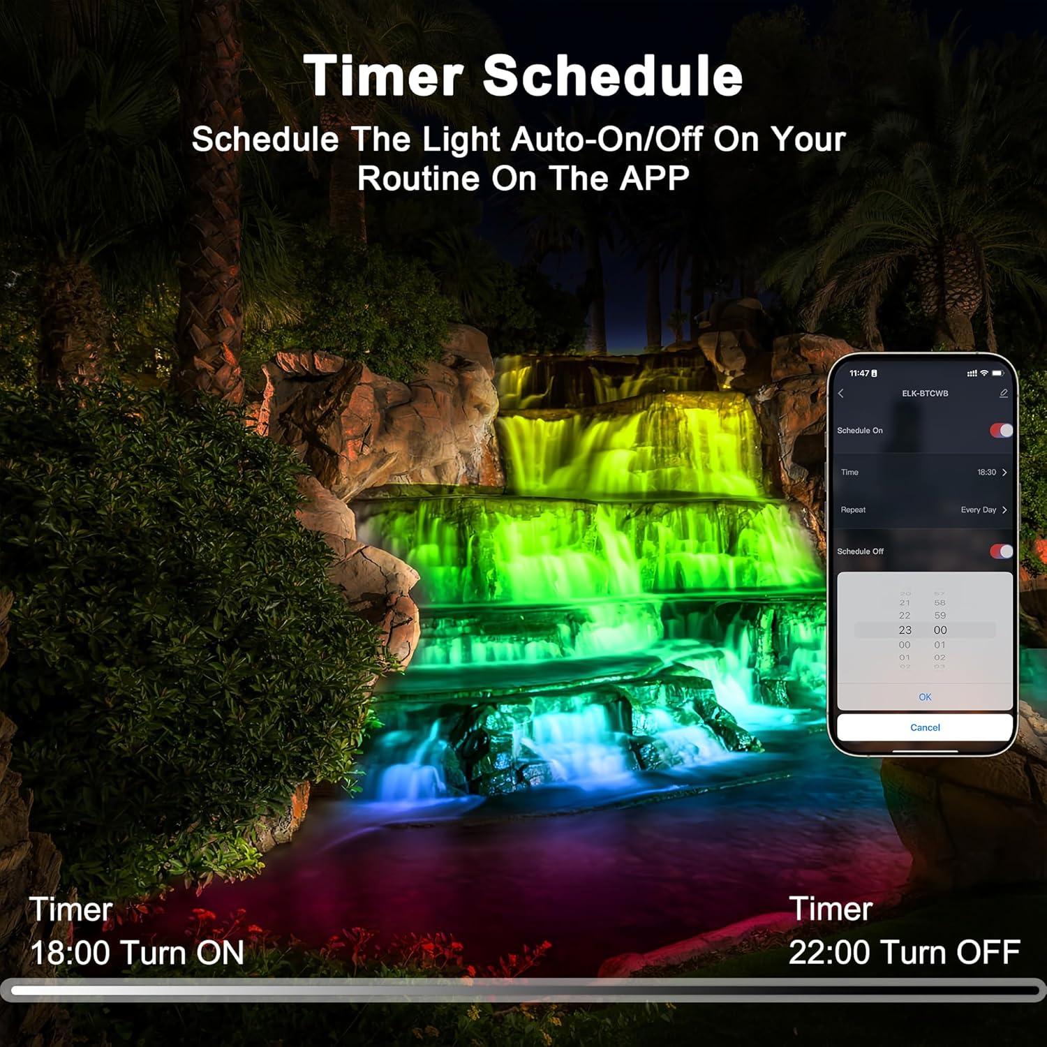 - [APP CONTROL & TIMER FUNCTION] This smart pond light supporting APP control, just tap your smart phone, you can remotely control millions of RGB color combinations, adjust the brightness of the light, play music, and design your favorite garden scenes. You can also preset the time, no need to repeat the operation, Save time and electricity!