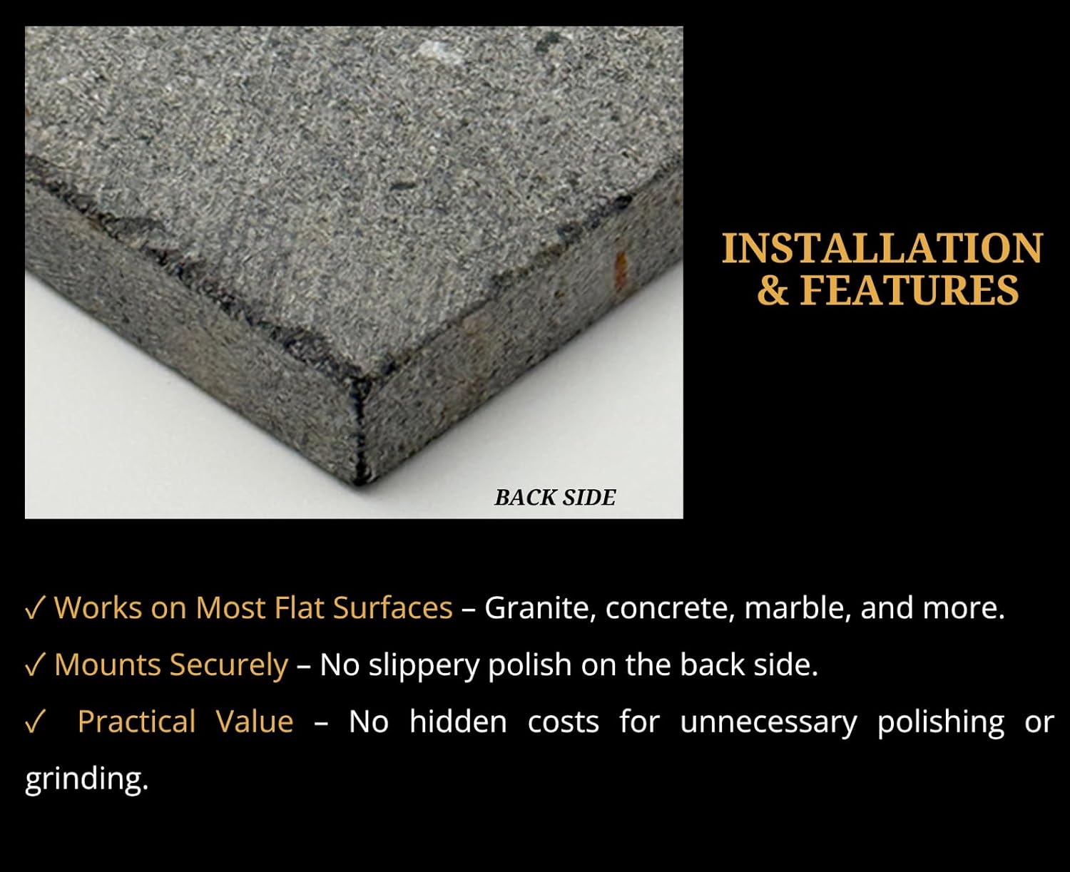 - Unpolished Sides for Stronger Bond – Ensures a secure attachment to granite, marble, concrete, and other solid surfaces. The back edges may have small natural chips from the cutting process.