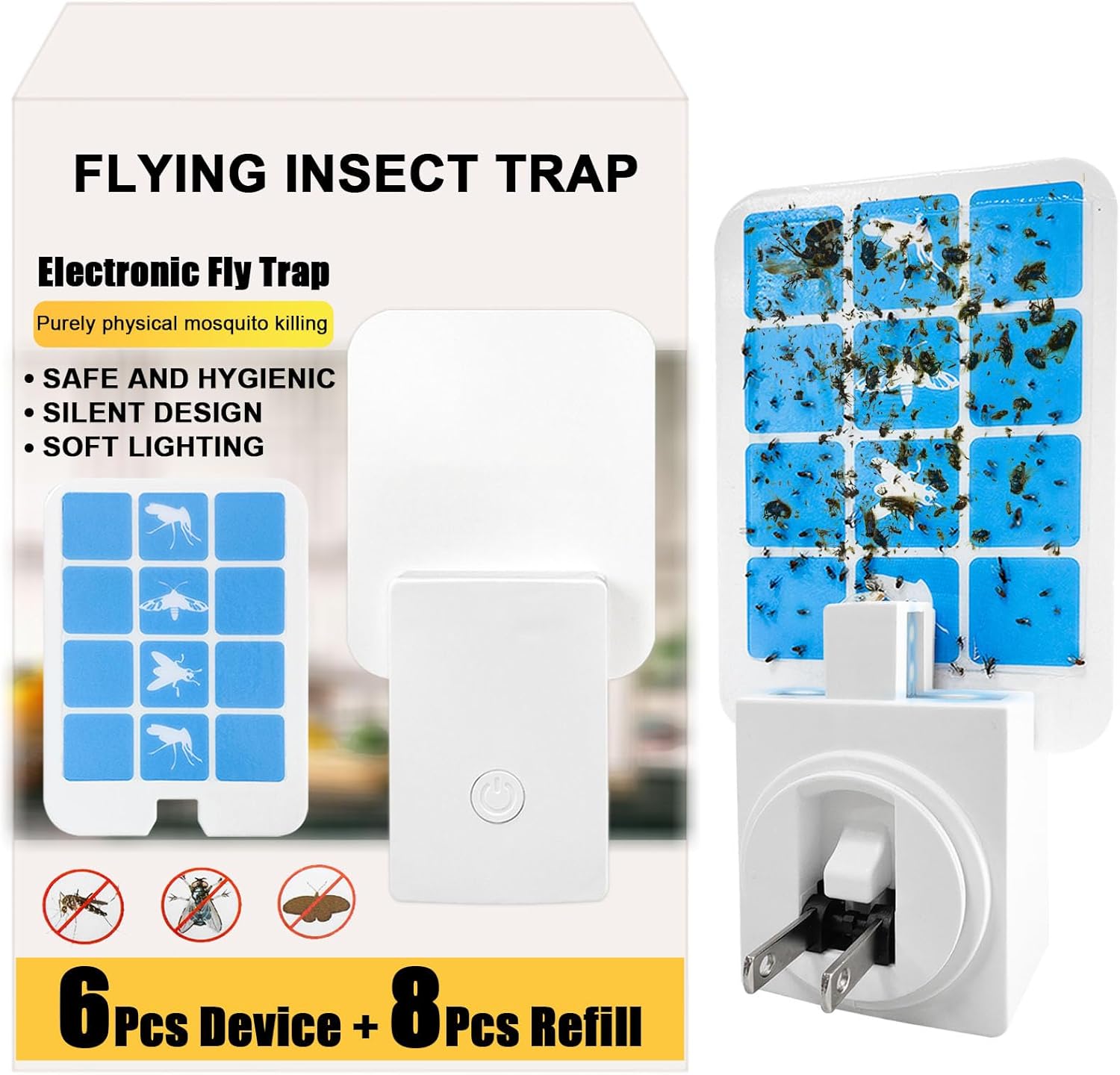 Plug in Indoor Fly Trap for Gnat Moth Houseflies Fruit Flies, Blue Light Bug Light Trap Compatible with Safer Home Indoor Fly Trap Refill, Mosquito Flying Insect Trap, 6 Device+8 Refill