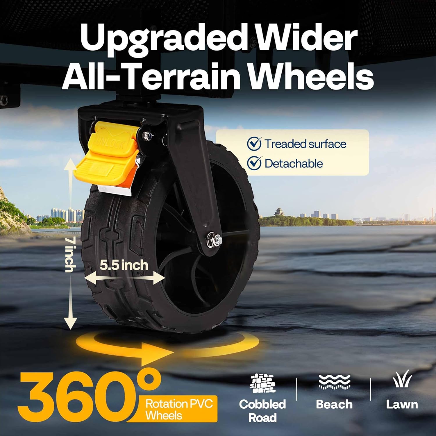 - OVERSIZED WHEELS FOR ANY TERRAIN: Equipped with large 7" x 5.5" PVC wheels that deliver excellent grip across gravel, sand, grass, or pavement; Tires are detachable for easy replacement and cleaning; Treaded surface improves traction, while the built-in tire brake ensures safety and prevents movement on slopes or uneven surfaces