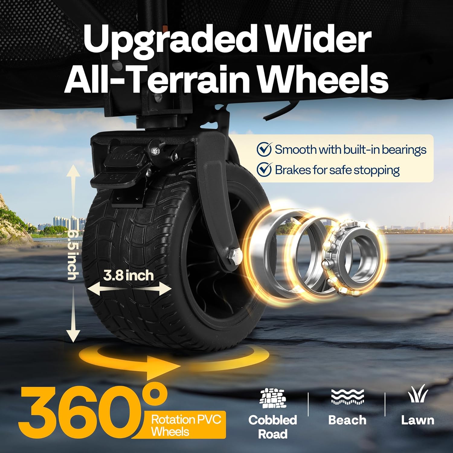 - ALL-TERRAIN MOBILITY: Outfitted with oversized 6.3 x 3.7 inch PVC wheels that are detachable for easy maintenance and replacement; High-precision bearings ensure smoother and more efficient movement with reduced noise and resistance; Treaded tires grip a variety of surfaces, while the built-in tire brake system offers solid control and safety on sloped or uneven terrain