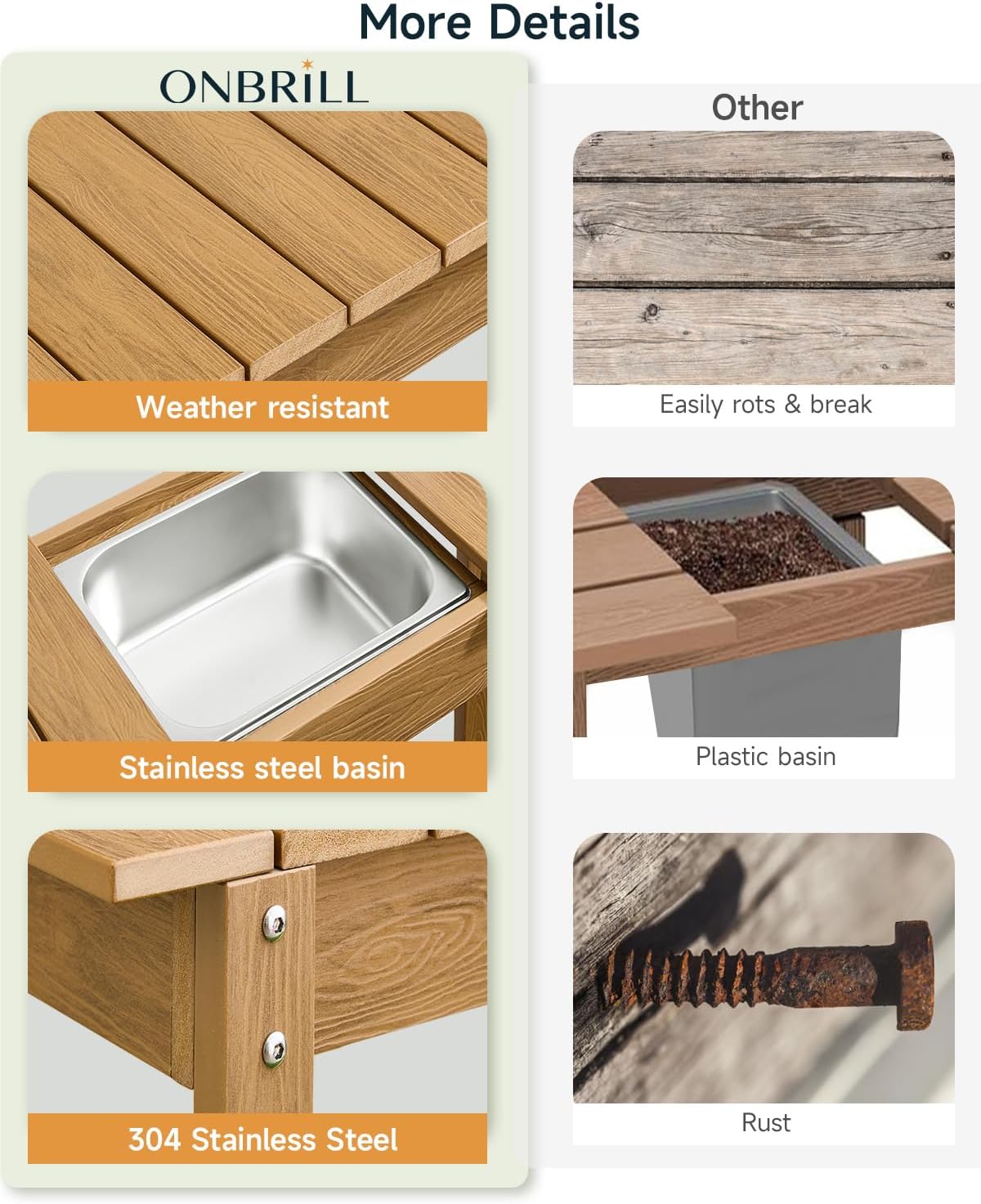 - Ample Storage Space – Featuring a 3-tier shelves, double-sided sliding table top and removable sink design, this potting table provides plenty of room for potted plants, tools, soil, and accessories. Keep everything organized and within easy reach for a seamless gardening experience