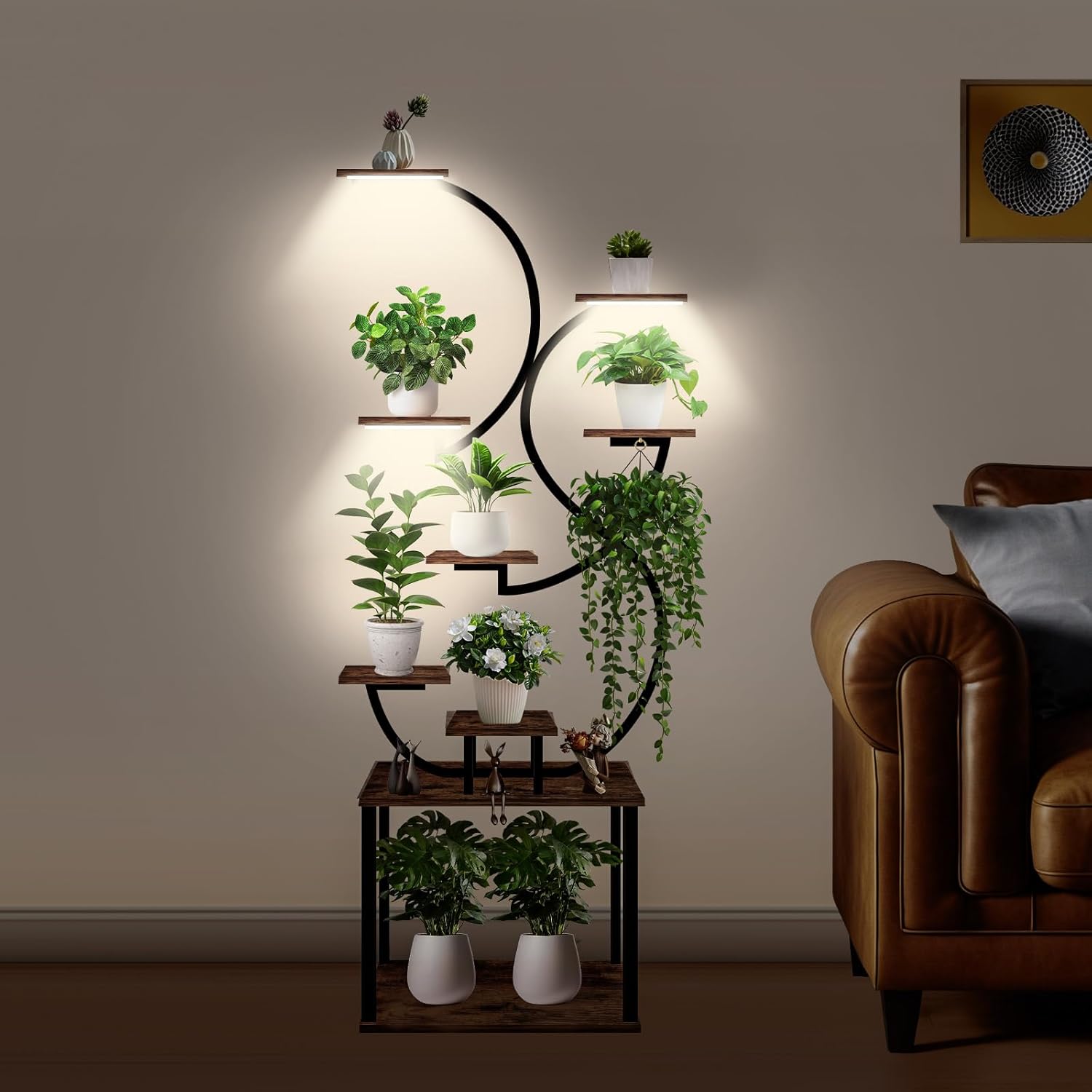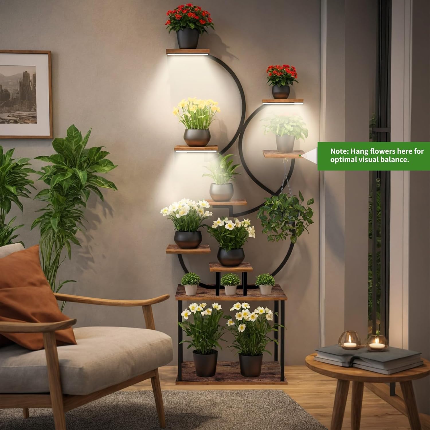 - 【9-Tiers & 62.2" S-Shaped Design】 This tall plant stand offers 9 tiers, 9 pot stands, and 1 hook for hanging potted plants(Note: Hang flowers on the fourth board ). Lighted plant stand providing ample space to display multiple plants while saving floor area. The elevated design of the plant stands indoor clearance adds vertical greenery to any space.