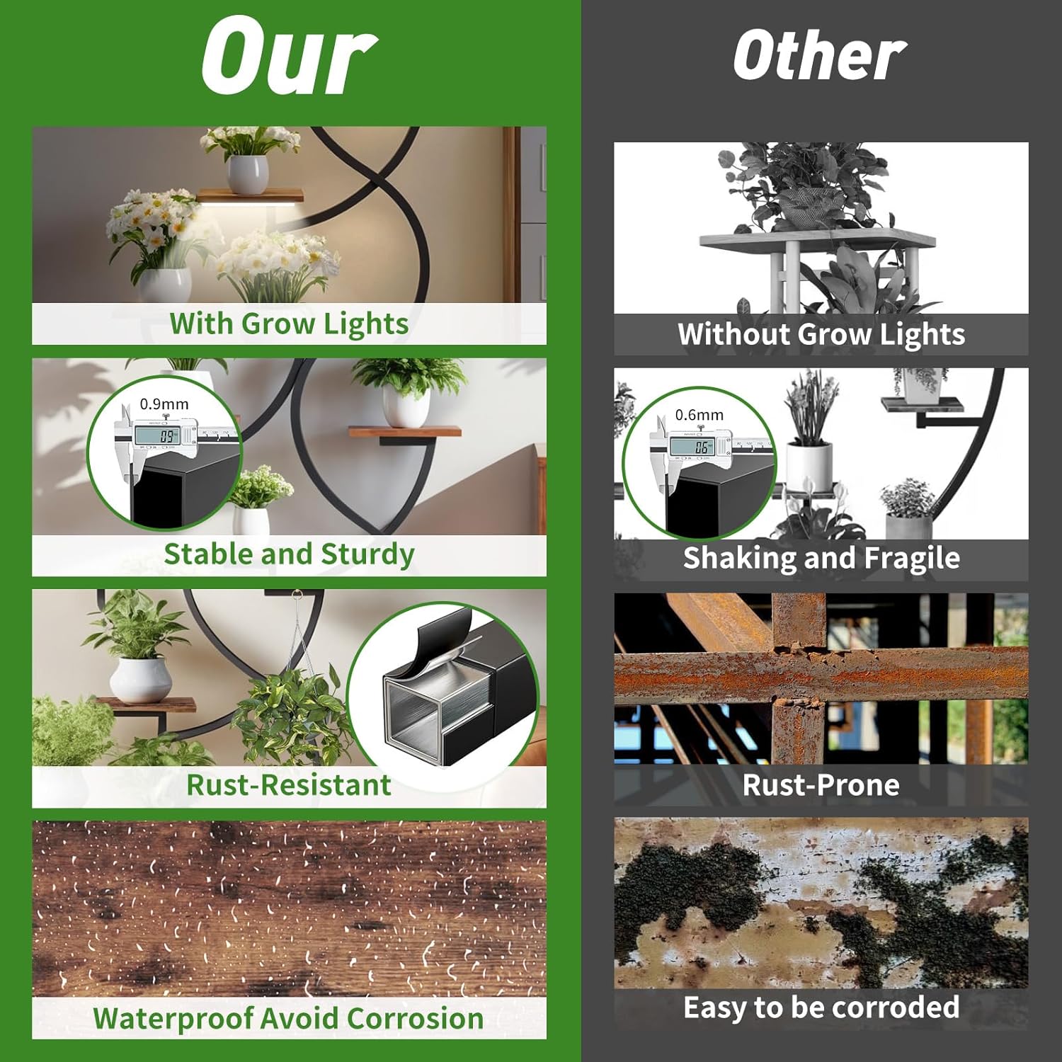 - 【Durable Metal Plant Stand】 Flower stands for indoor plants built with heavy-duty iron pipes (0.9mm thick) and waterproof high-quality 20mm particleboard shelves, can resist corrosion, warping, and curling, this plant shelf ensures stability and longevity. Rust-proof coating and anti-tip furniture straps (included) enhance safety for homes with kids or pets.