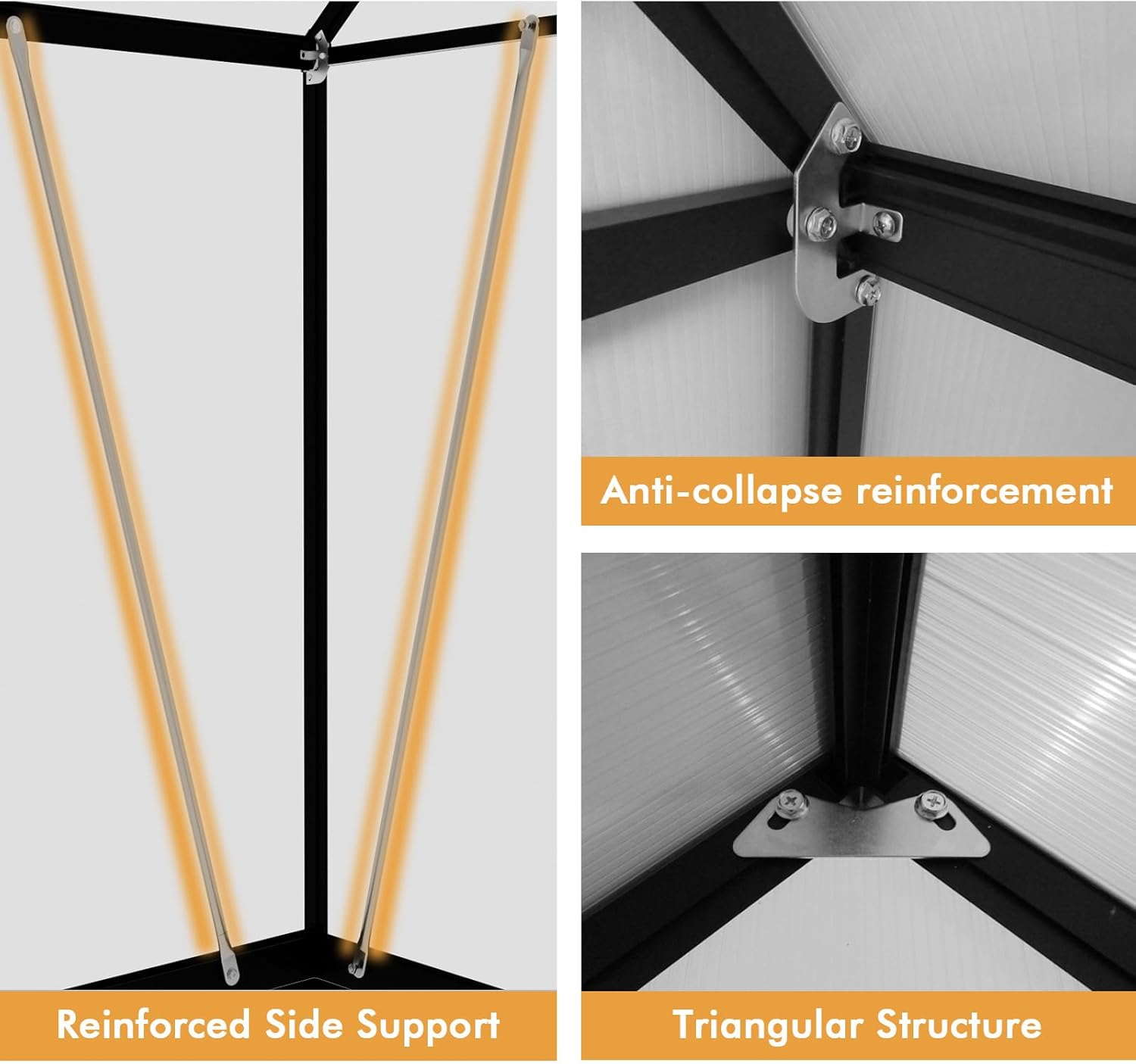 - QUALITY UV RESISTANT PANELS – The 580g PC panels of this polycarbonate greenhouse that are 4mm thick and twin-wall polycarbonate roof panels are designed for strength and clarity. These shatterproof panels let in just the right amount of light while controlling humidity and temperature in your greenhouse. They effectively block harmful UV rays, creating the great environment for your plants to thrive and preventing sunburn