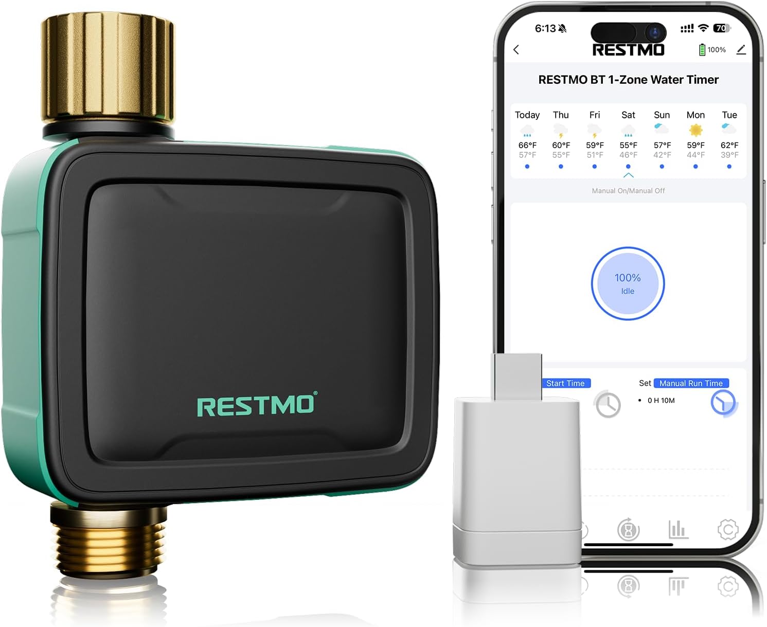 - 【Smart Manual Control & Weather-Resistant Design】With IP55 waterproof protection and durable leakproof construction, this timer is built to withstand outdoor conditions. Easily activate manual watering (1–24 hrs) via the app or one-touch button—perfect for quick adjustments without affecting your set schedules. The rain delay feature lets you pause irrigation for 24/48/72 hours during wet weather, helping conserve water and protect your plants.