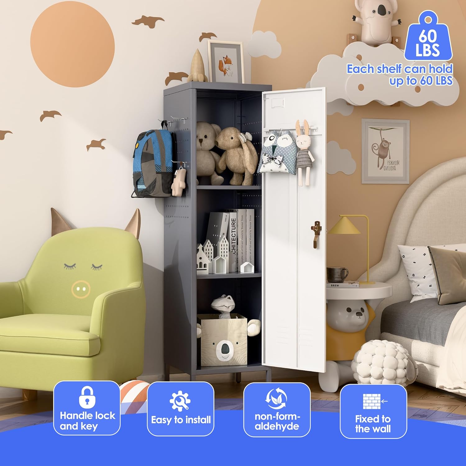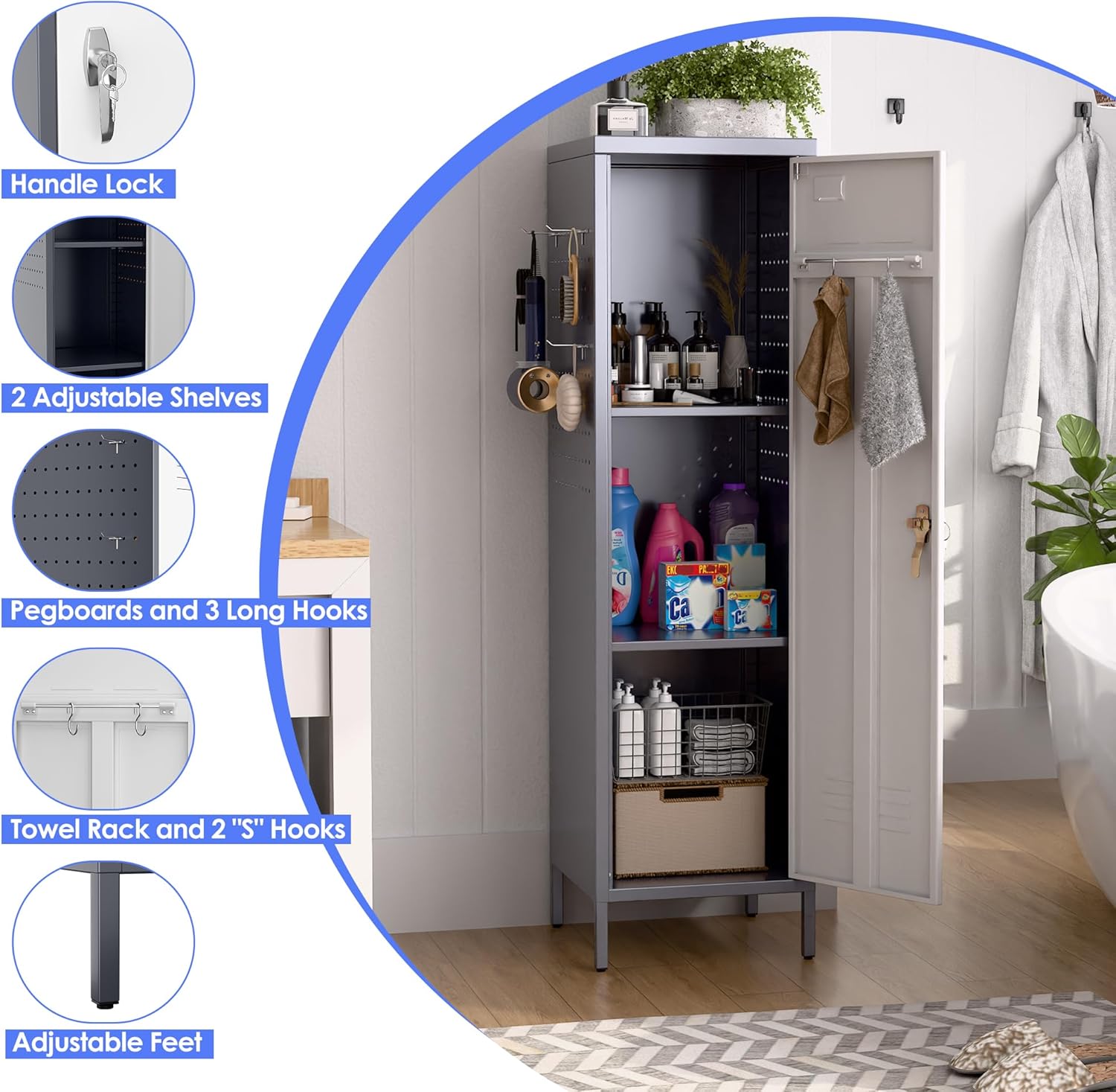 - 【Large Storage Capacity】Metal storage locker door has a towel rack with two S-hooks for hanging towels.The Pegboards on both sides of the locker have three long hooks that can be used to hang clothes