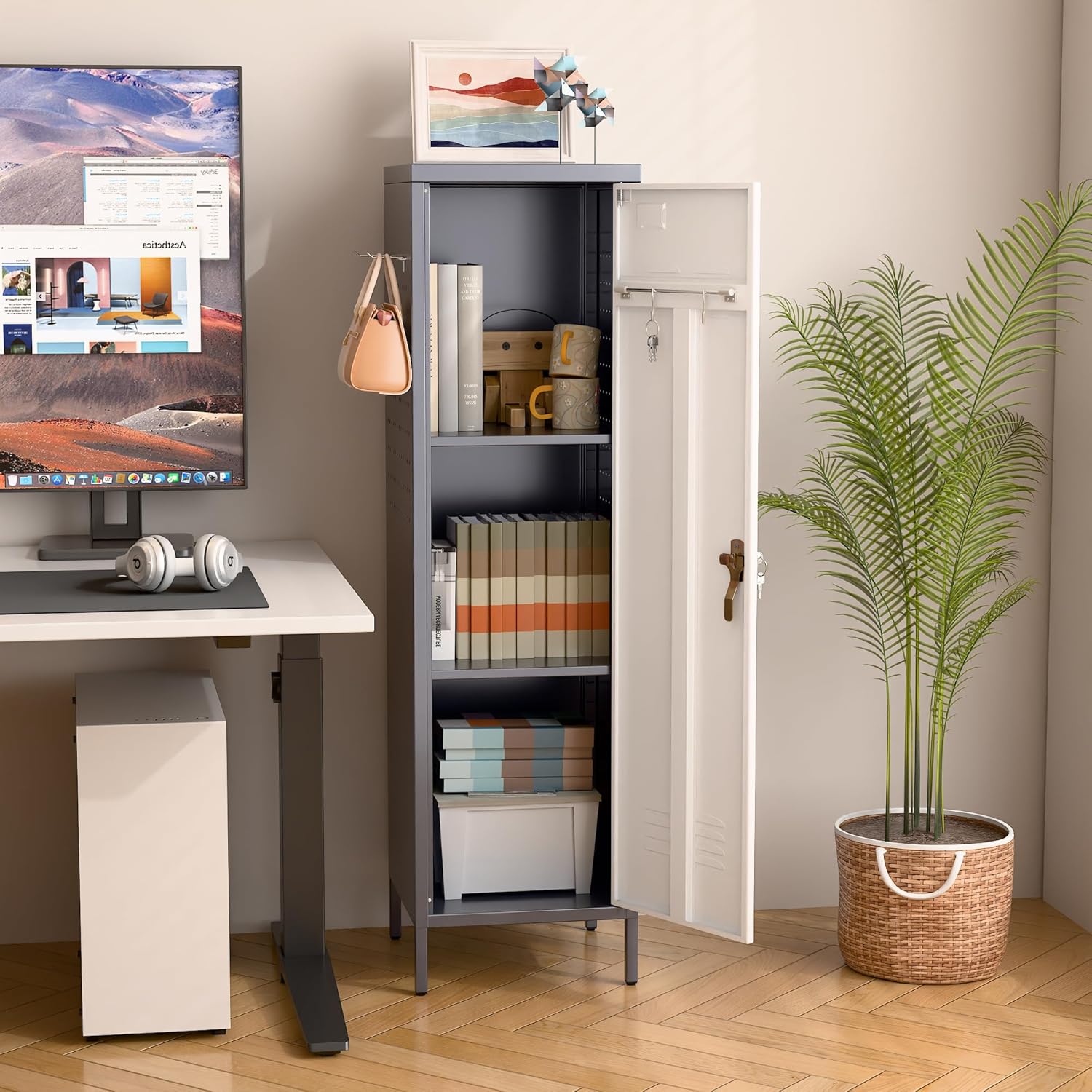 METAN Metal Storage Lockers with Handle Lock and 2 Adjustable Shelves,Office Storage Locker with Pegboards and Hooks,Assembly Required,Grey White