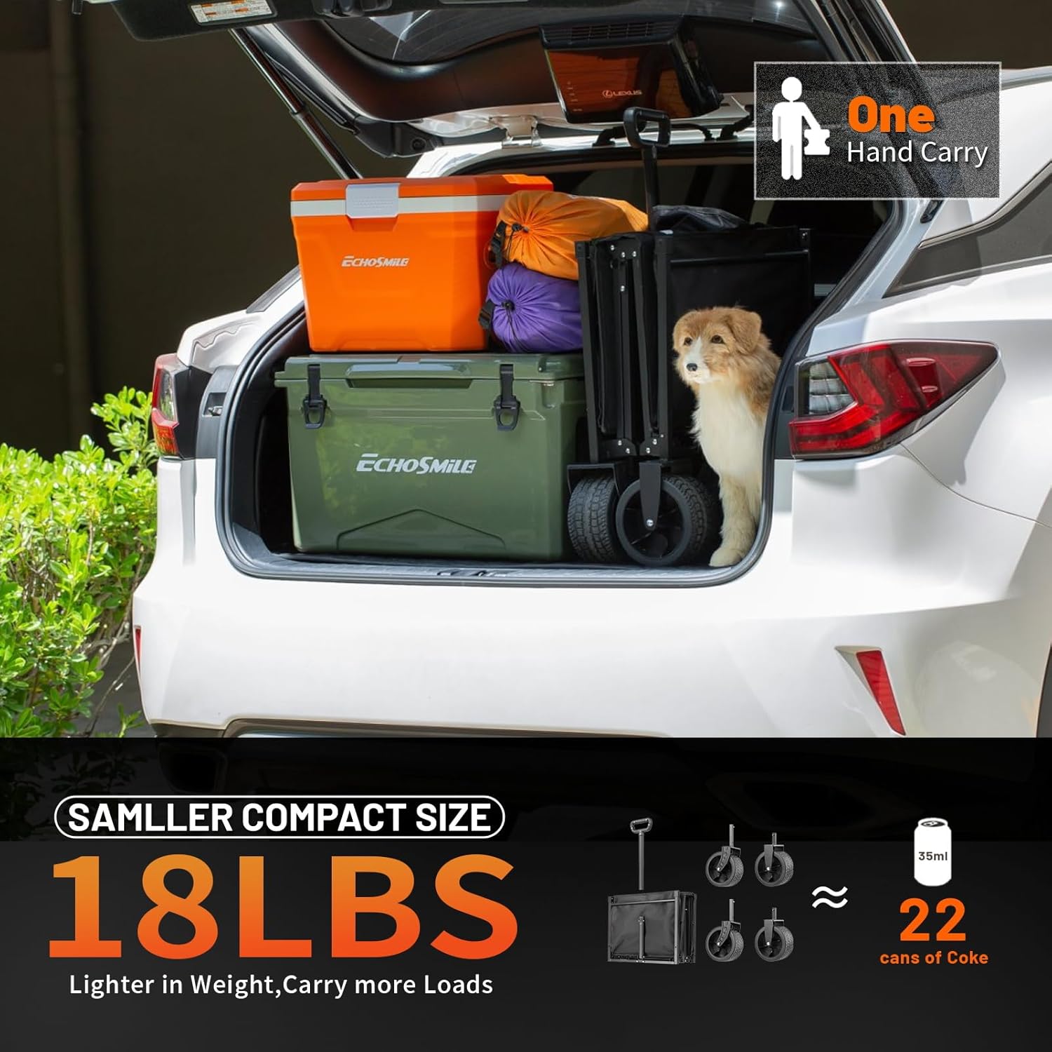 - 【EASY TO FOLD & CARRY】With our innovative fold-flat design, it can be easily folded or unfolded in seconds without the need for any tools.Weighing in at only 18 lbs, folded dimensions: 14“ x 32” x 23”.The EchoSmile collapsible wagon is easy to carry around, or can be easily stored in the trunk of your car, closet, pantry or garage. It comes with a built-in handle, making it easy to take with you wherever you go.