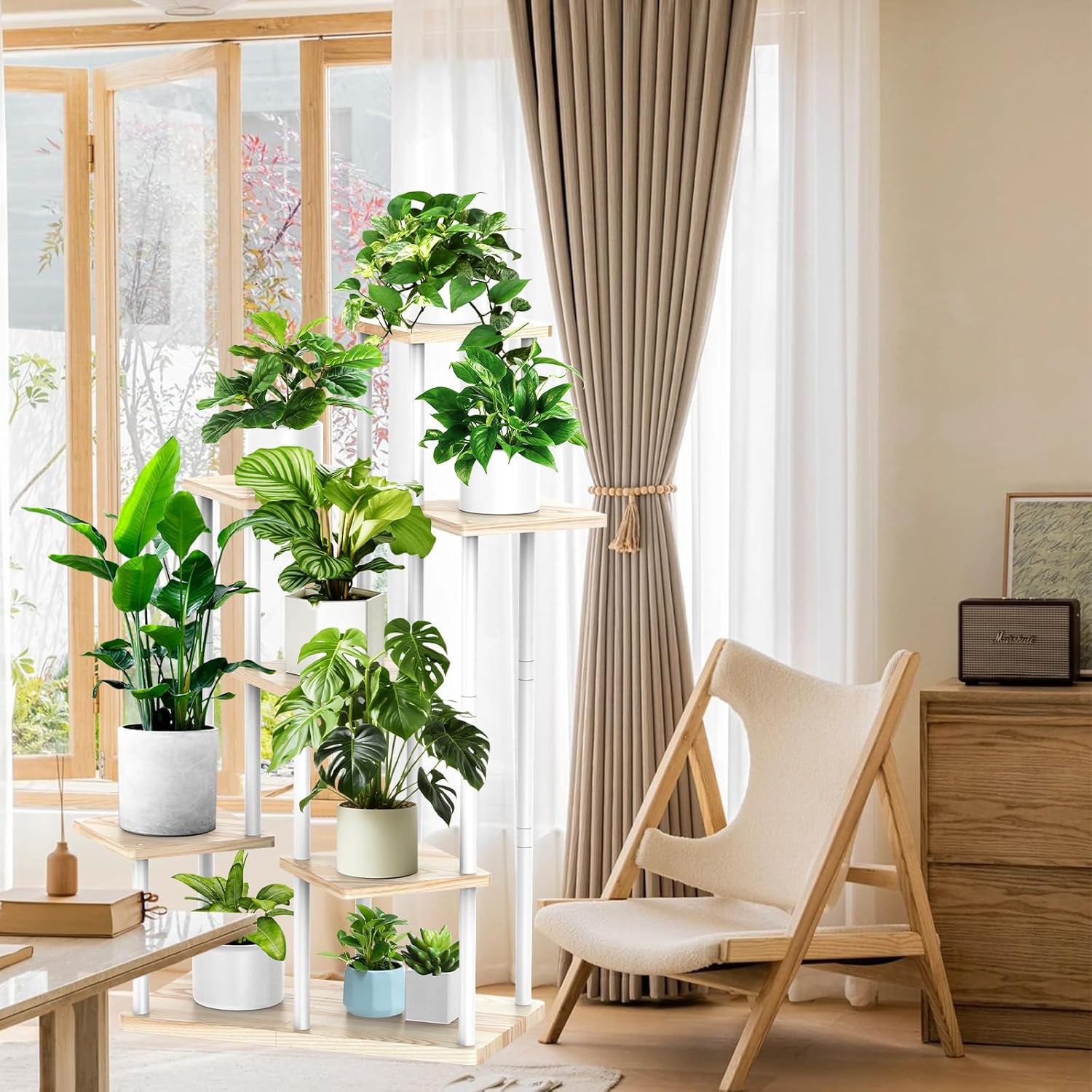 7 Tier Wood Tall Plant Stand Metal Rack Indoor, Multiple Flower Pot Holder Shelves Corner Rack, Planter Shelf Display Rack Storage Organizer for Patio Living Room Balcony Garden(White Oak)