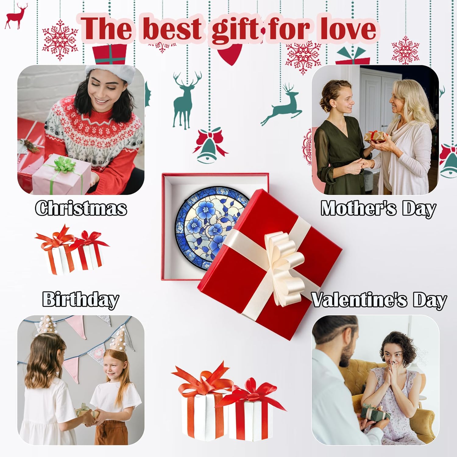 Stained Glass Window Hanging, Blue and White Plum Blossom Sun Catcher for Door Home Decor Flowers Suncatcher Christmas Mother's Day Birthday Gifts for Women Men Mom and Nana 9.8 in