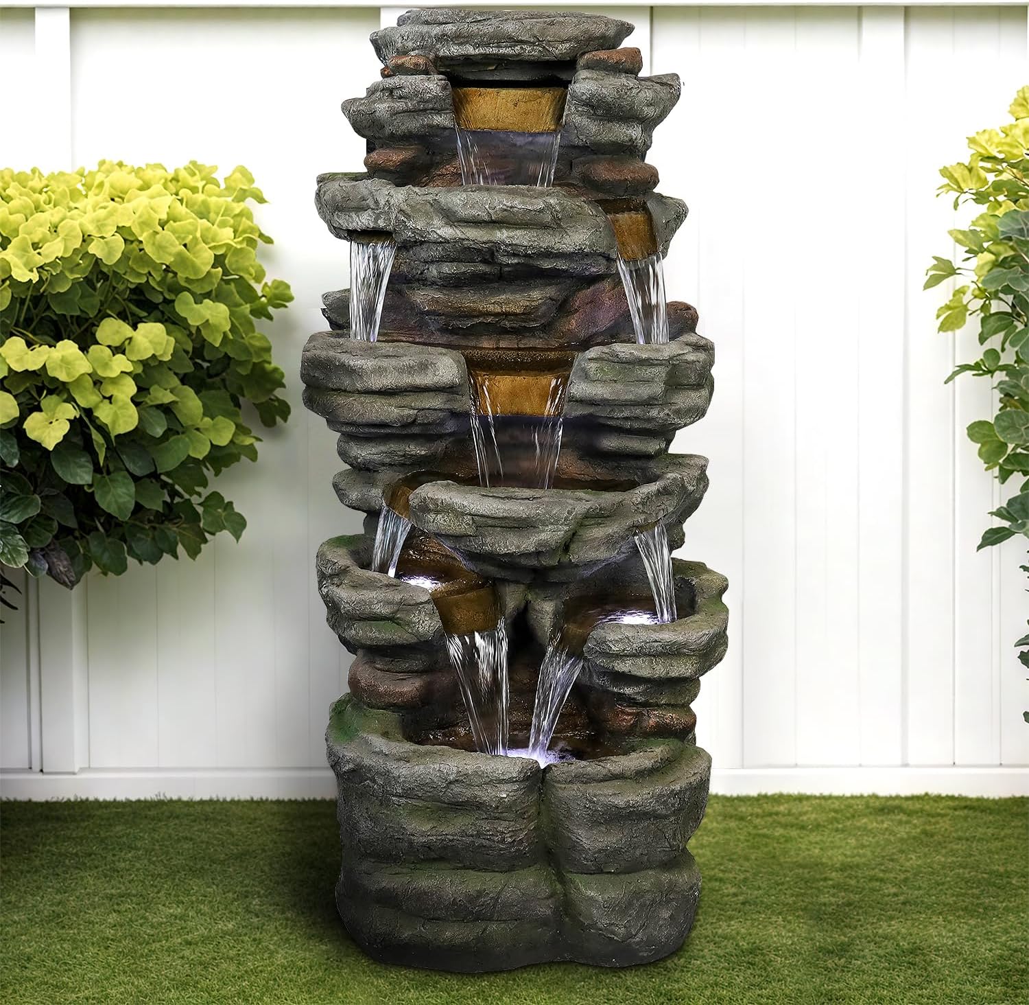 SunJet 47.2" High Cascading Rock Outdoor Water Fountain with LED Lights - Large Outdoor Resin Fountains and Waterfalls for Garden or Patio, Yard, and Deck Decor, Featuring Natural Stone Look
