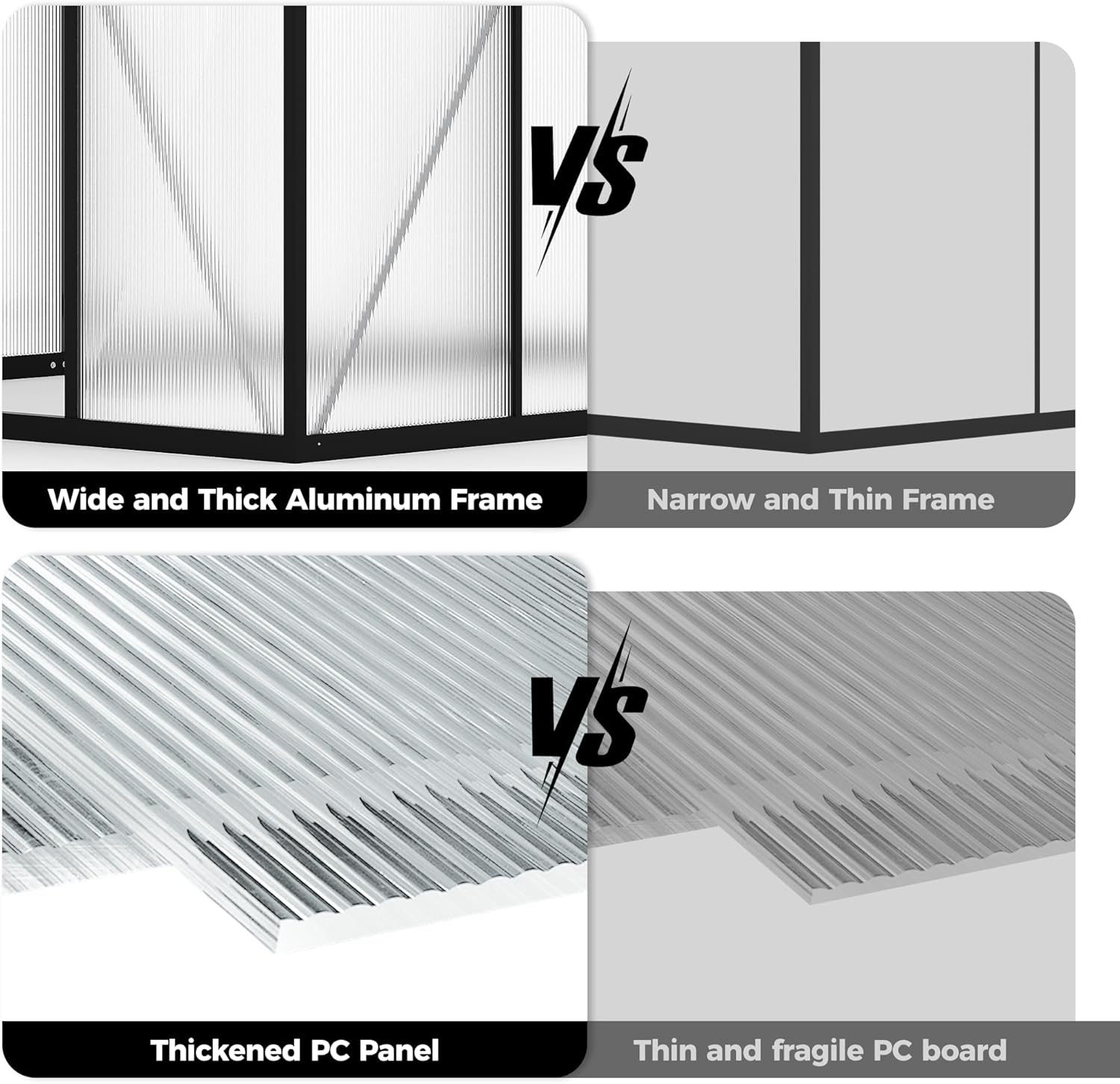 - 【Durable structure】The walk-in greenhouse is made of high-quality polycarbonate and reinforced aluminum frames, they offer robust protection against wind, rain, and snow. To increase stability, anchor the footing in soil or concrete. The reinforced side walls and base have improved their resistance to wind and snow. For your convenience and security, it comes equipped with a robust metal handle and a lockable door.