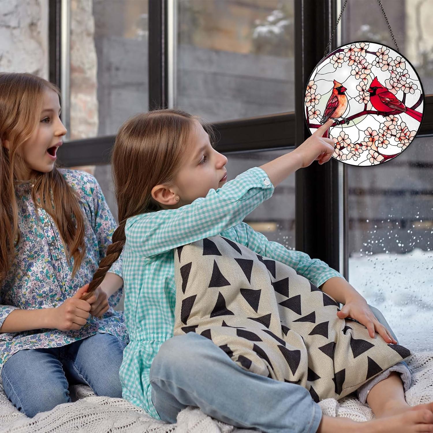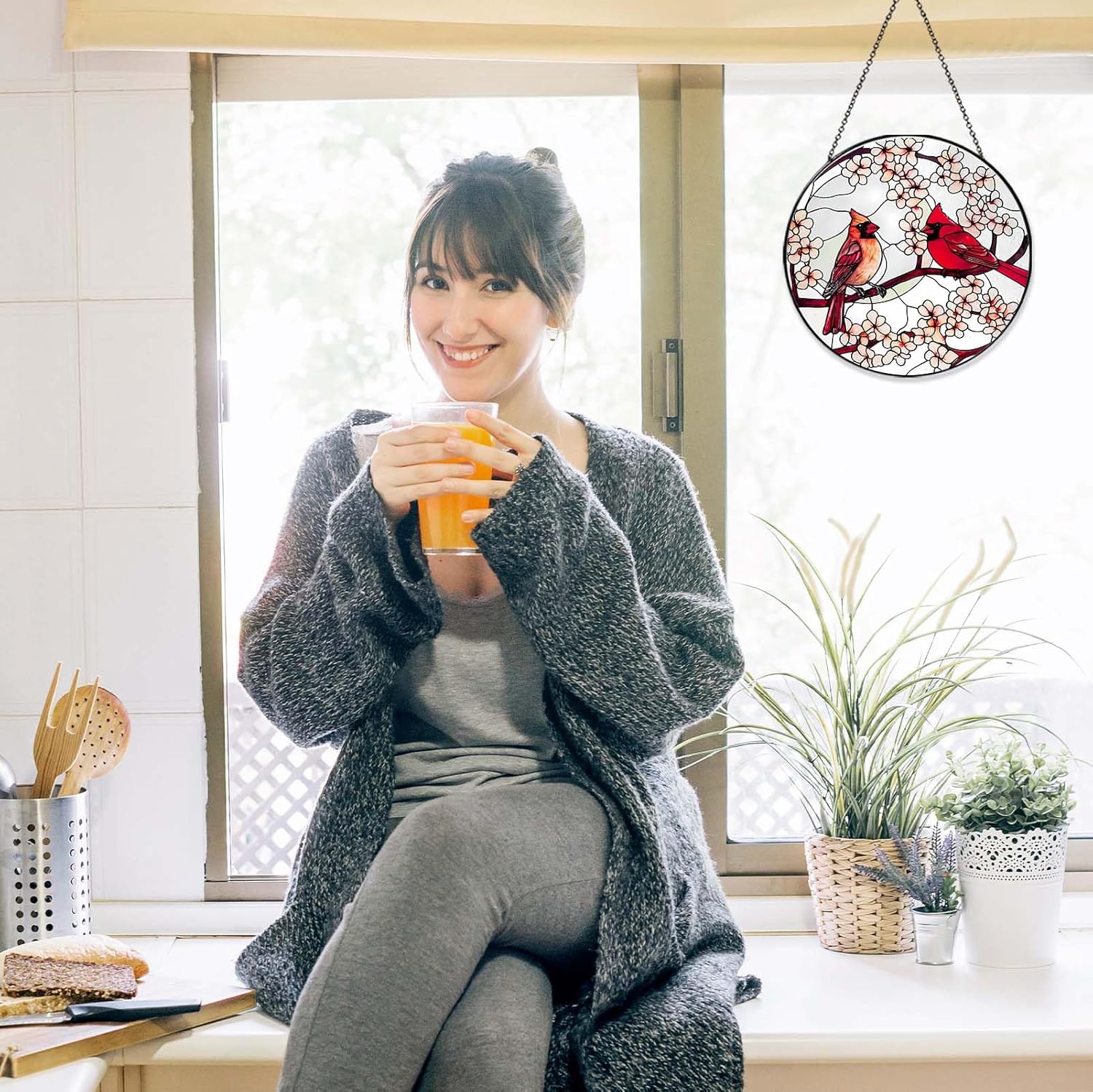 Cardinal Sun Catcher Stained Glass Window Hanging Cardinal Decor Gifts for Women Handmade Sun Catcher Decoration for Garden Home Housewarming Gift Valentine's Day Gifts(6 inch)