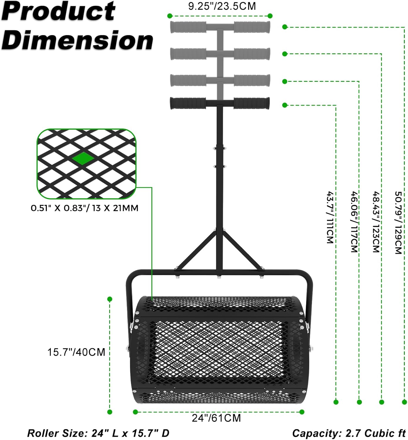 - 4. Upgraded Side Latches: The peat moss roller is designed with two of the latest side locks that will not be crushed during rolling on the lawn. The unique design ensures the basket remains closed during tipping and tumbling operations, making it durable and tidy