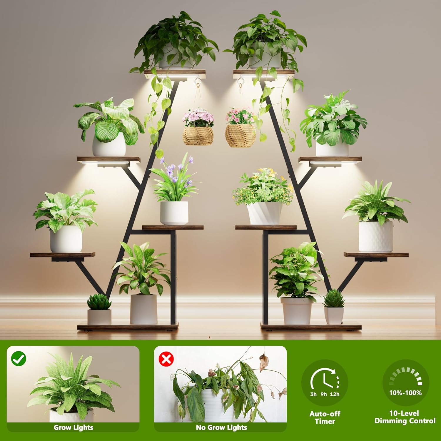 - Tested Grow Light System: Our indoor plant stand with full-spectrum LED grow lights is engineered to optimize photosynthesis for houseplants. The energy-efficient LED grow lights feature a 12-hour automatic timer with auto on/off function. Delivering hands-free convenience. Enhance your plant parenting experience while adding stylish touches to your indoor garden decor.