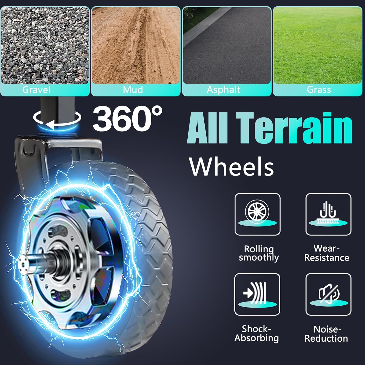 - All-terrain Wheels: With all-terrain wheels, this collapsible wagon with wheels can move smoothly on most terrains, such as hard sand, grass, mud, etc. The front wheels can rotate 360° and come with brakes, allowing you to adjust the direction more flexibly and maintain stability on the slopes. Note: Please do not use it on soft sand.