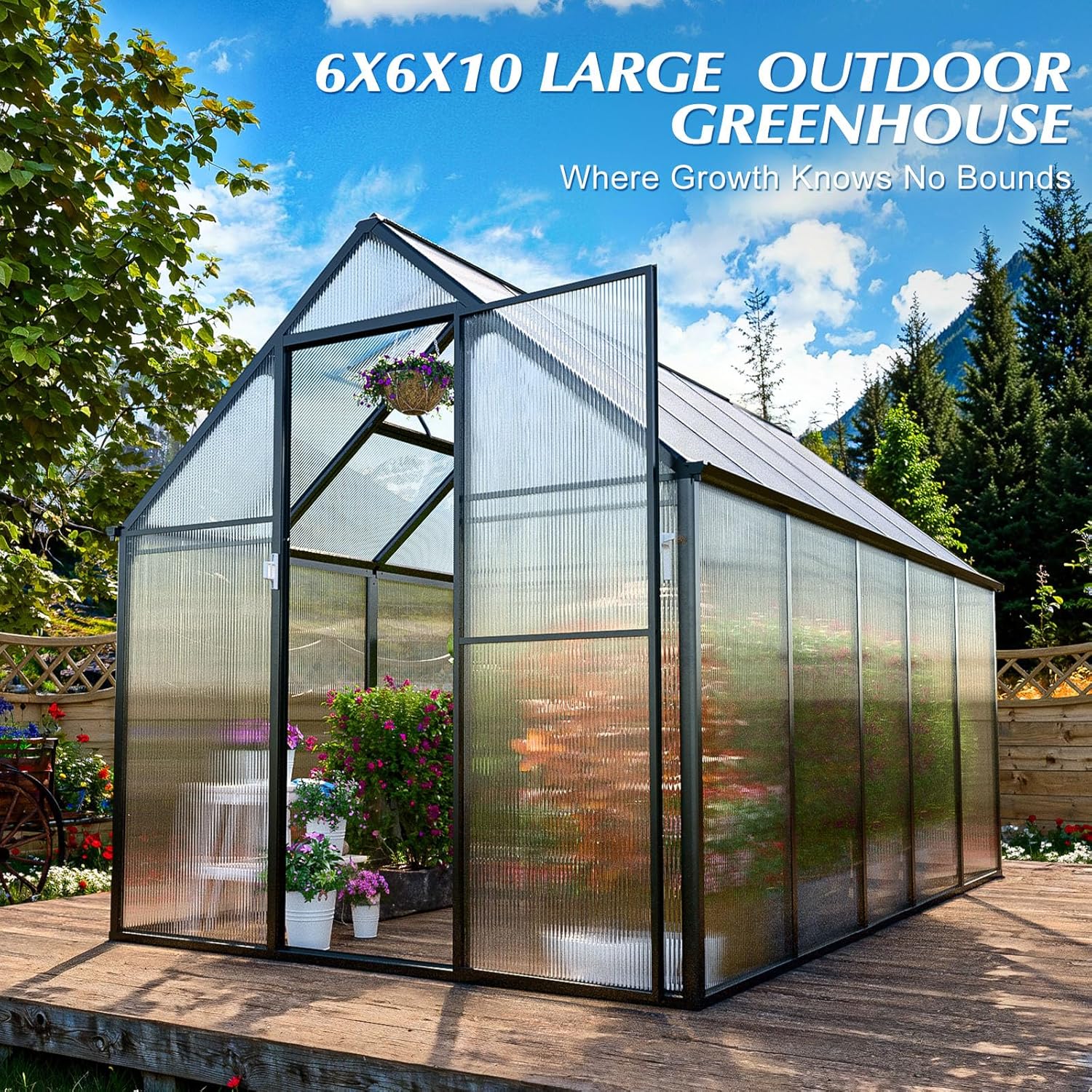 6'x10' Snap-Together Greenhouse - Easy 3-Way Connectors, Heavy-Duty Aluminum Frame, Wind/Snow Resistant for Gardening/Urban Farming, Includes Sliding Door & Ventilation Windows