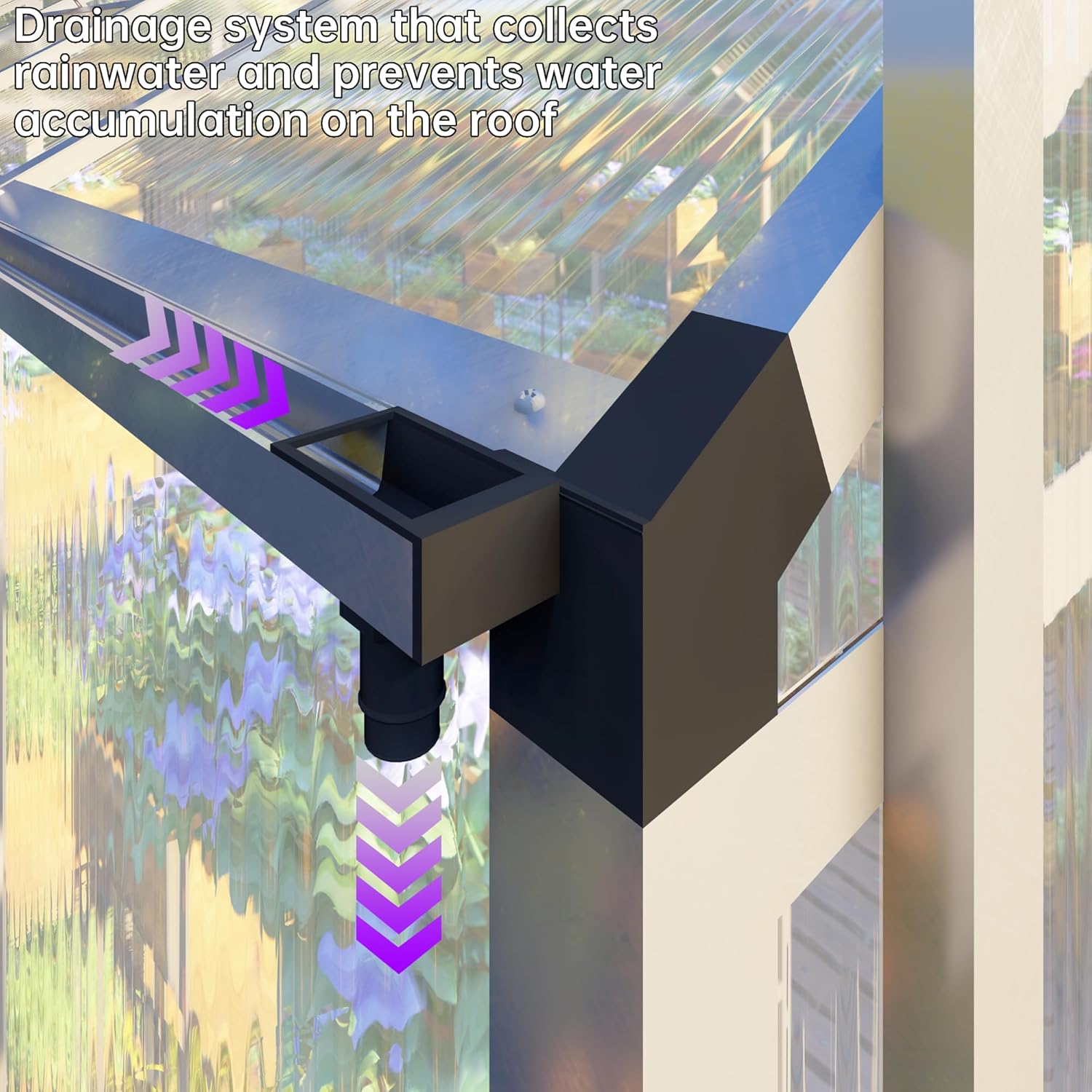 - WEATHER RESISTANCE: The high-density PC panels shield plants from harmful UV rays, while the adjustable multi-level ventilation skylight ensures optimal oxygen flow. The temperature range is -13°F to 140°F. Practical rain gutters collect rainwater for efficient use