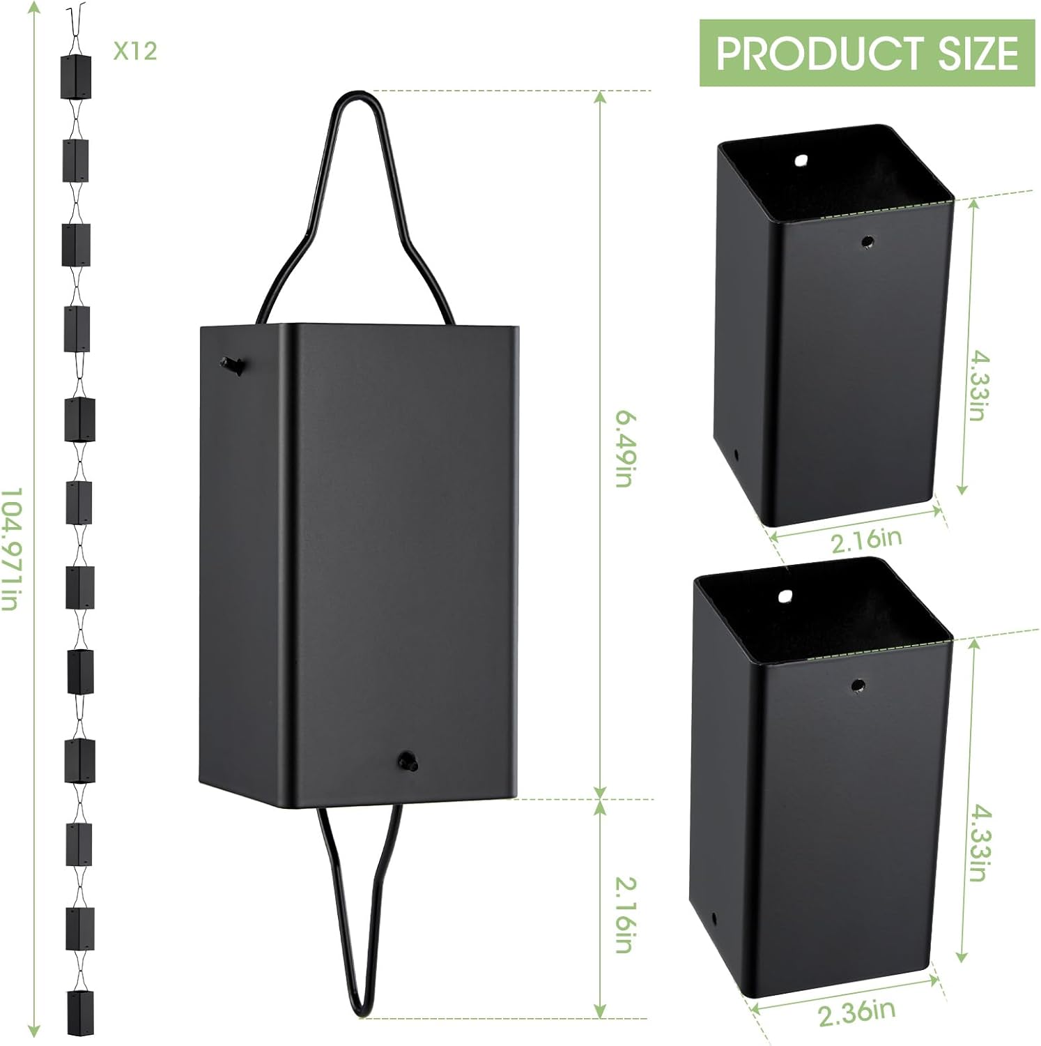 - 6 Bigger Size Cups: 2.36in X 2.36in; 6 Standard Size Cups:1.97in X 1.97in; Chain Length 8.5 feet; 12pcs Cup;Big enough to catch the rain coming out of the larger downspout and avoid rainwater splashing