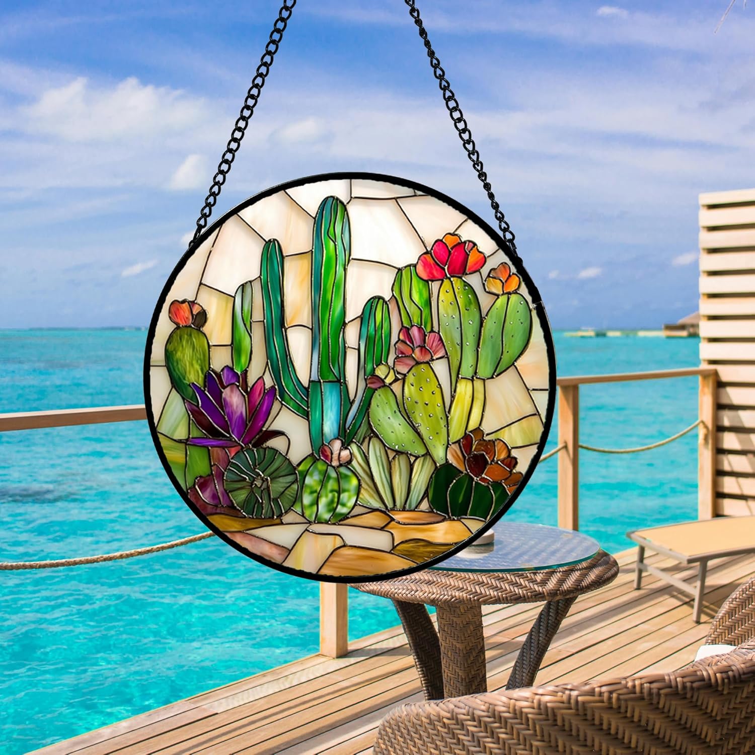 Stained Glass Window Hanging, White Green Cactus Suncatcher Diamond Glass Panel Hangings Sun Catchers Decor for Birthday for Women, Men, Wife, Aunt, and Mom 14.9x14.9 in